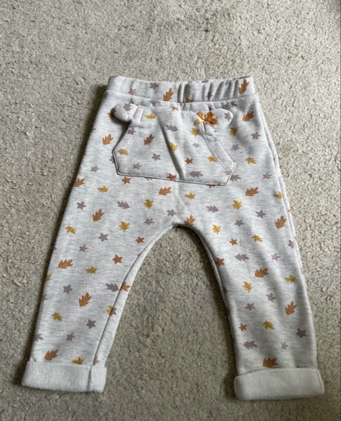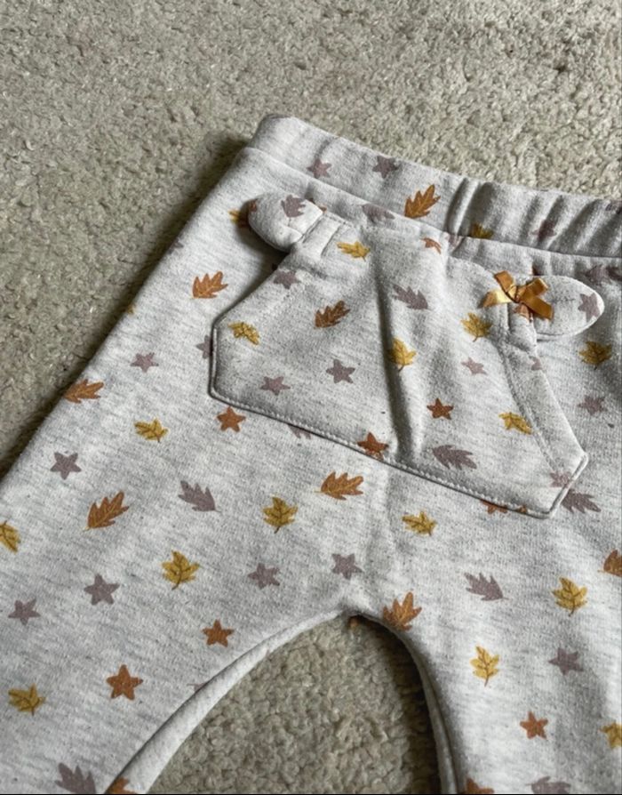 Jogging/ pantalon pour fille en taille 18 mois de la marque Orchestra. Jogging gris avec des feuilles en motif. > 74% polyester 21% coton
