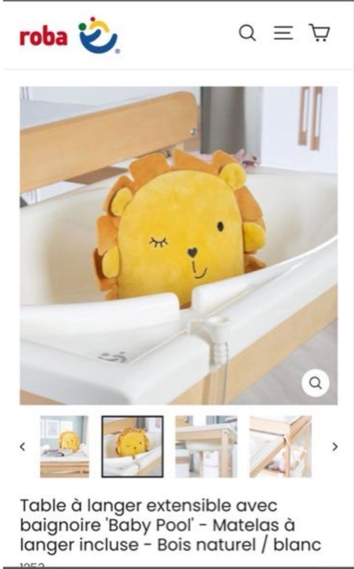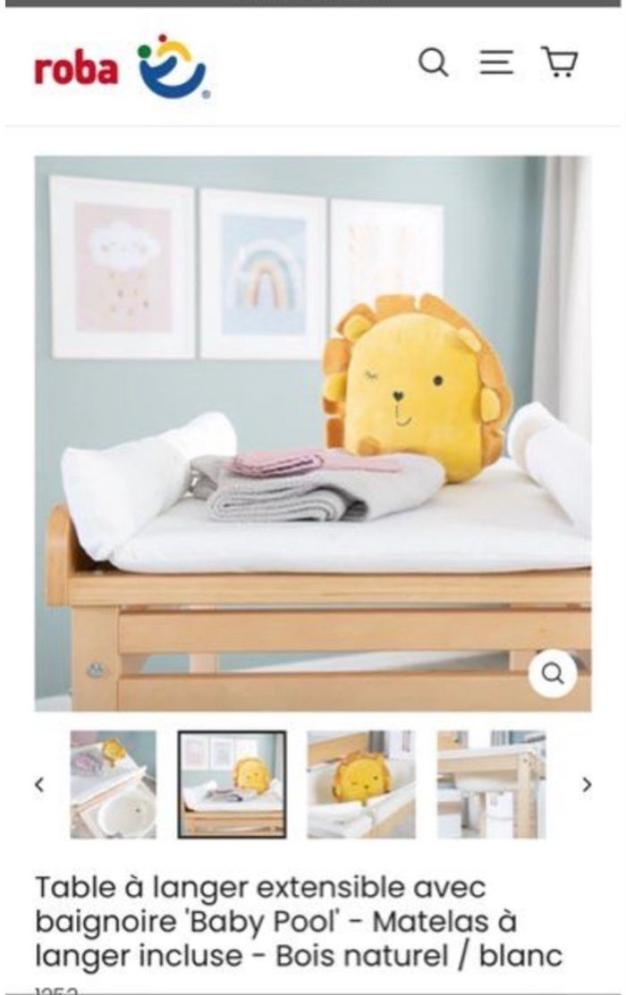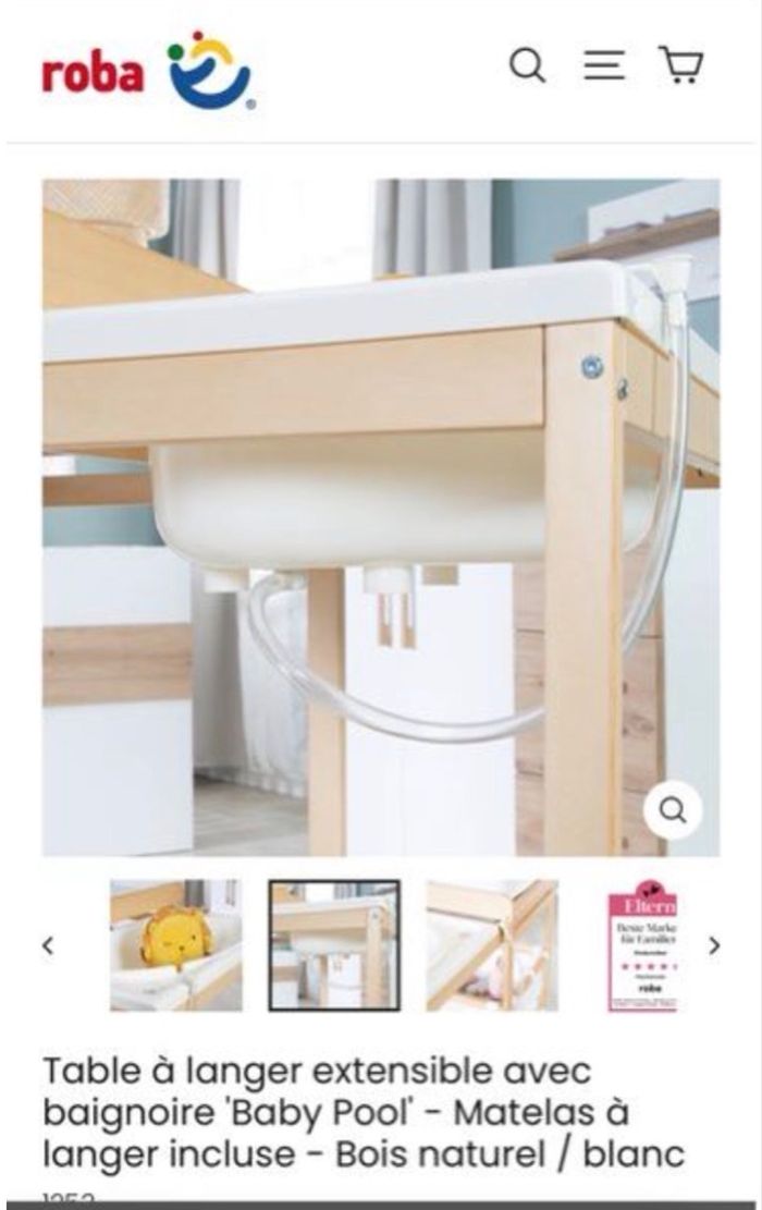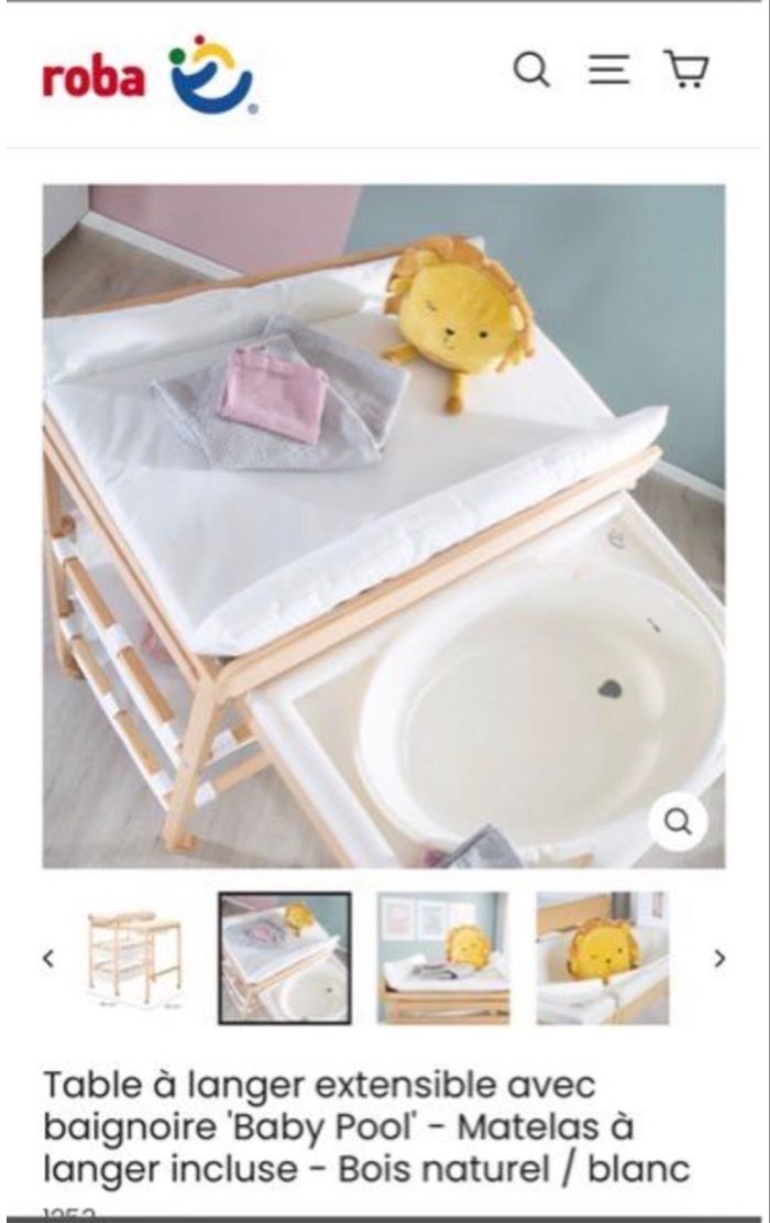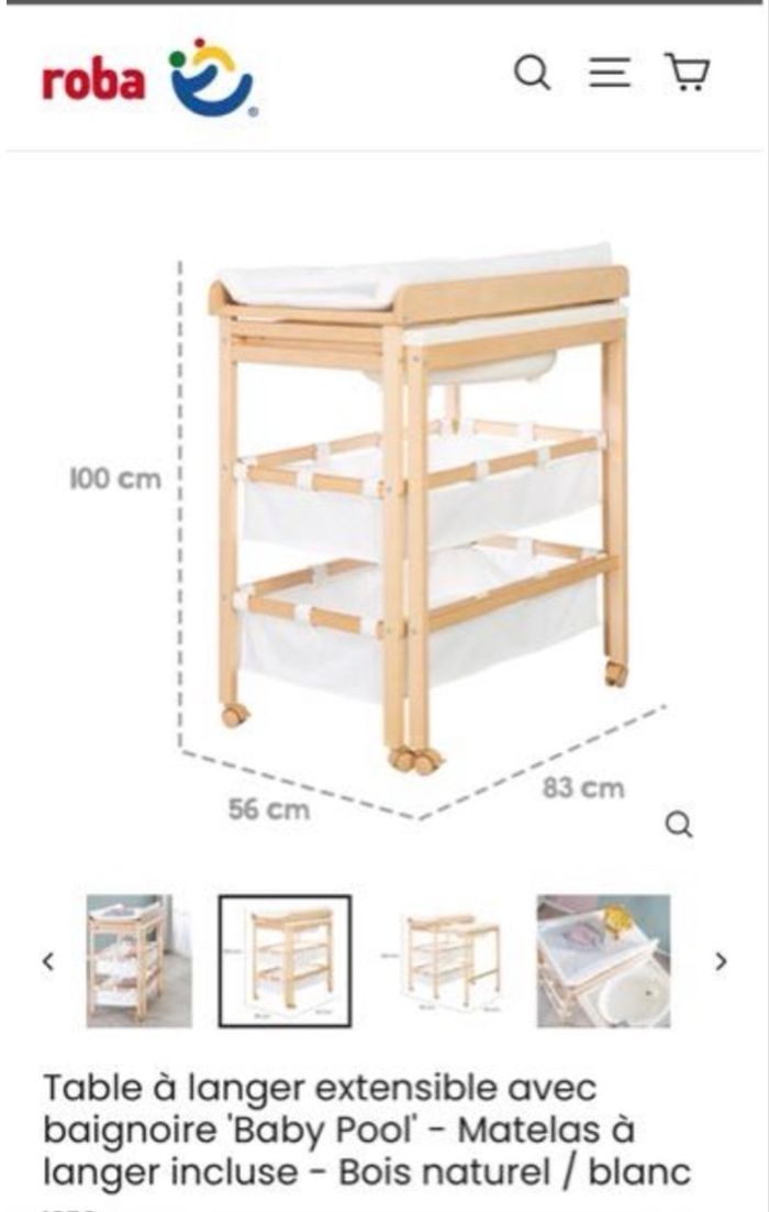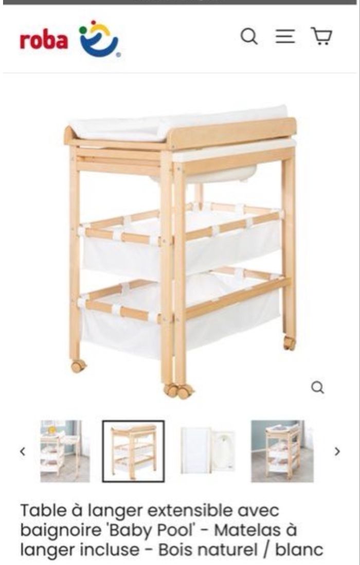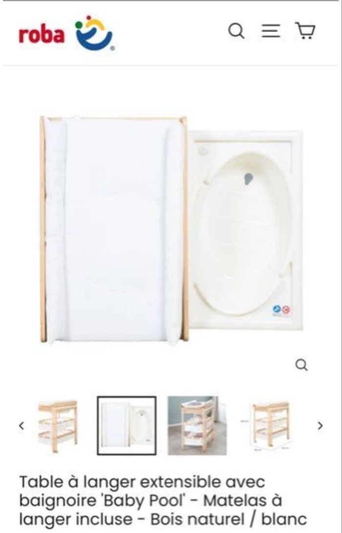 Je vends une table à langer extensible avec baignoire intégrée Roba “Baby Pool”, reçue en cadeau mais qui ne convient finalement pas. État : • Neuf, dans son emballage d’origine, jamais ouvert • Aucun défaut, aucun montage effectué Marque : Roba (marque allemande) • Modèle : Baby Pool • Référence fabricant : 1253 • Inclus : matelas à langer + baignoire intégrée • Coloris : bois naturel / blanc • Table extensible, pratique et gain de place Prix neuf : 269,90 € sur le site officiel Roba Prix de vente : 120€