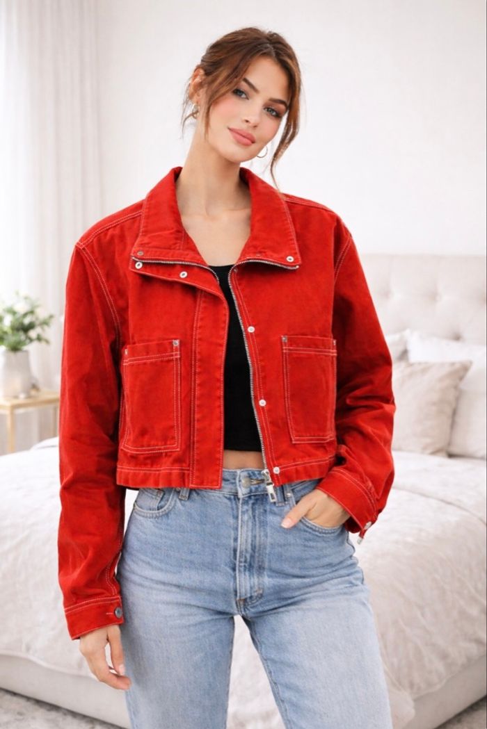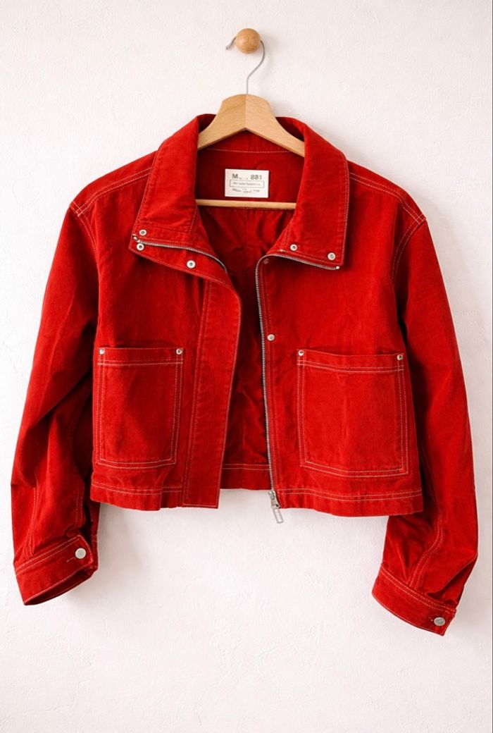 Veste en jeans rouge, taille M, marque Pull and Bear Prix en magasin : 39,99€