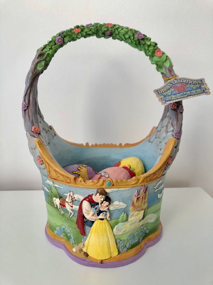 Disney traditions/Jim Shore/Enesco Panier décoratif inspiré de Blanche-Neige avec des détails peints à la main Comprend des œufs décoratifs colorés à l'intérieur Scène romantique de Blanche-Neige et du prince à l'extérieur du panier Anse ornée de fleurs et de reliefs d'arbres magiques Fabriquée en résine de haute qualité avec des finitions détaillées