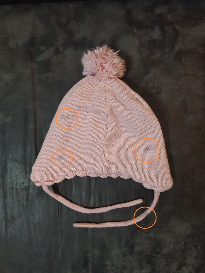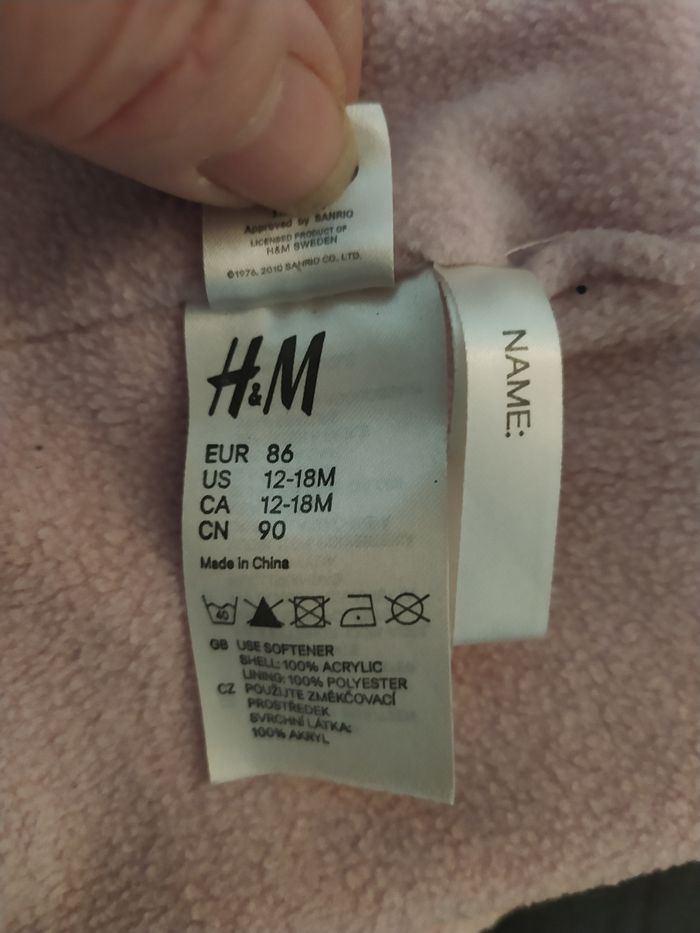 ⚠️ envoi à partir de 5€ d'achat⚠️ Bonnet Hello Kitty marque: Hello Kitty Sanrio par H&M taille: 12/18 mois, 86 extérieur en 100% acrylique, intérieur en 100% polyester, Couvrant tête et oreilles, avec 2 cordons État satisfaisant (j'ai voulu le coloré en noir, mais seule la broderie tête à pris la teinte, et s'est étalée + quelques tâches (voir ronds oranges)) OFFERT pour 5€ d'achat en manteau/vêtements bébé 😃 Me contacter quand vous avez fait votre lot, pour déduire le bonnet. ⚠️ envoi à partir de 5€ d'achat⚠️