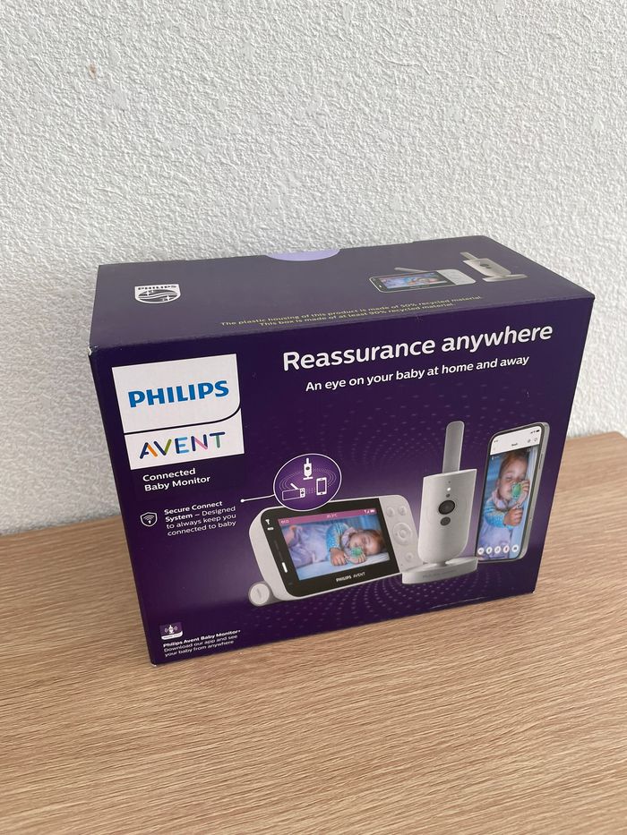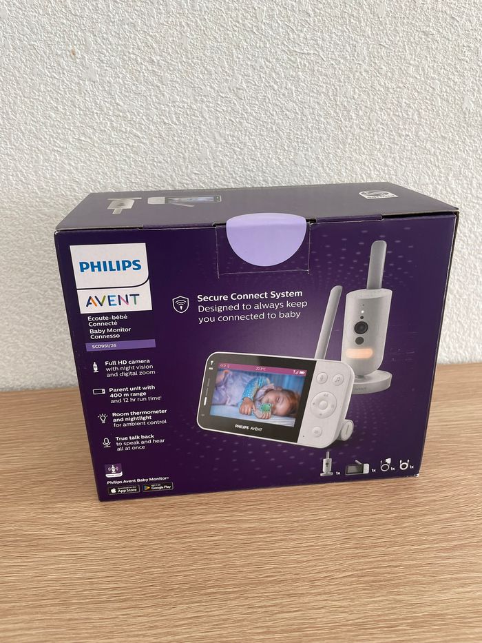 Babyphone Philips Avent SCD951/26 État : Neuf (jamais déballé) Le carton est encore sous scellé Envoi rapide et soigné Points forts du modèle : Système Secure Connect : Connexion ultra-sécurisée et privée (pas de risque d'interférence ou de piratage). Double mode : Fonctionne avec l’unité parentale (portée 400m) ET sur votre smartphone via l’application Baby Monitor+ (portée illimitée via Wi-Fi/4G). Vidéo Haute Définition : Caméra Full HD avec vision nocturne automatique très nette. Confort de bébé : Capteur de température intégré, veilleuse apaisante et plusieurs berceuses/sons relaxants. Interaction : Fonction "Répondre à bébé" pour le rassurer à distance. Autonomie : Jusqu'à 12h d'autonomie pour l'unité parentale en mode éco.