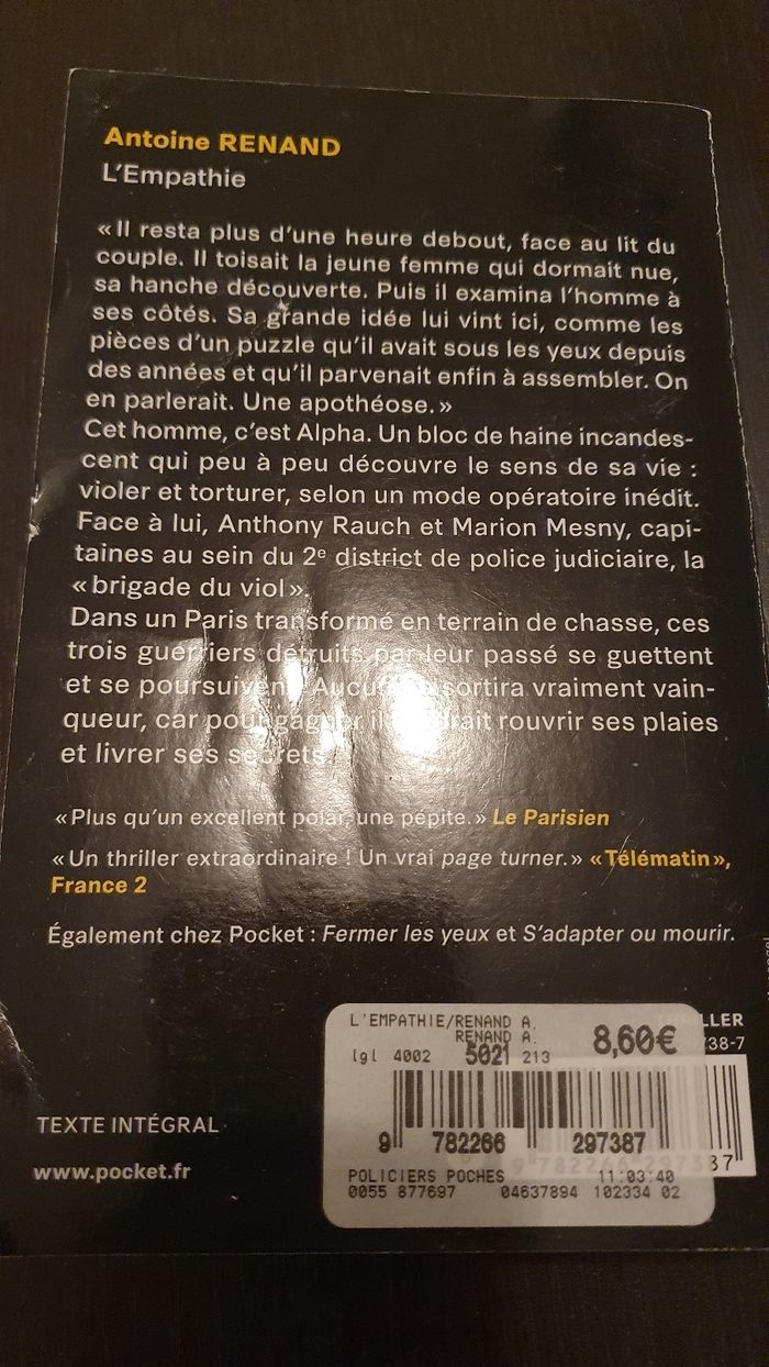 Je vends ce roman policier "L'empathie" d'Antoine Renand.