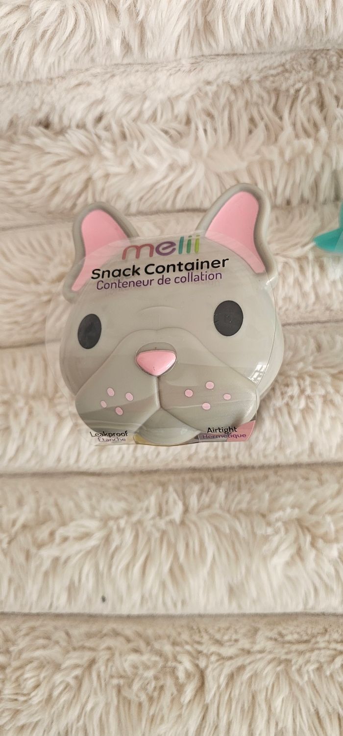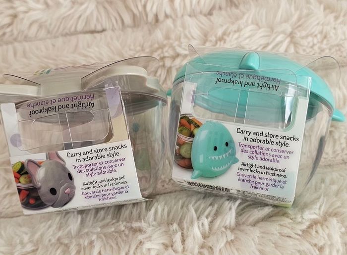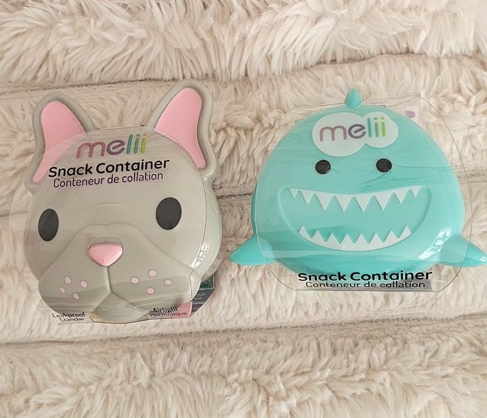 Lot de 2 boîtes hermétiques & étanches pour le goûter des enfants. Motifs bulldog 🐶 & requin 🦈 Idéal pour transporter ses petits gâteaux, fruits... sans risque que ca se renverse ! Contenance 232ml. Neufs.