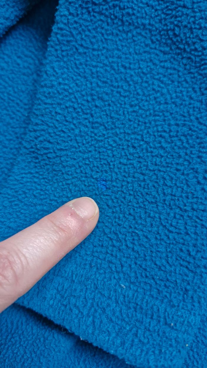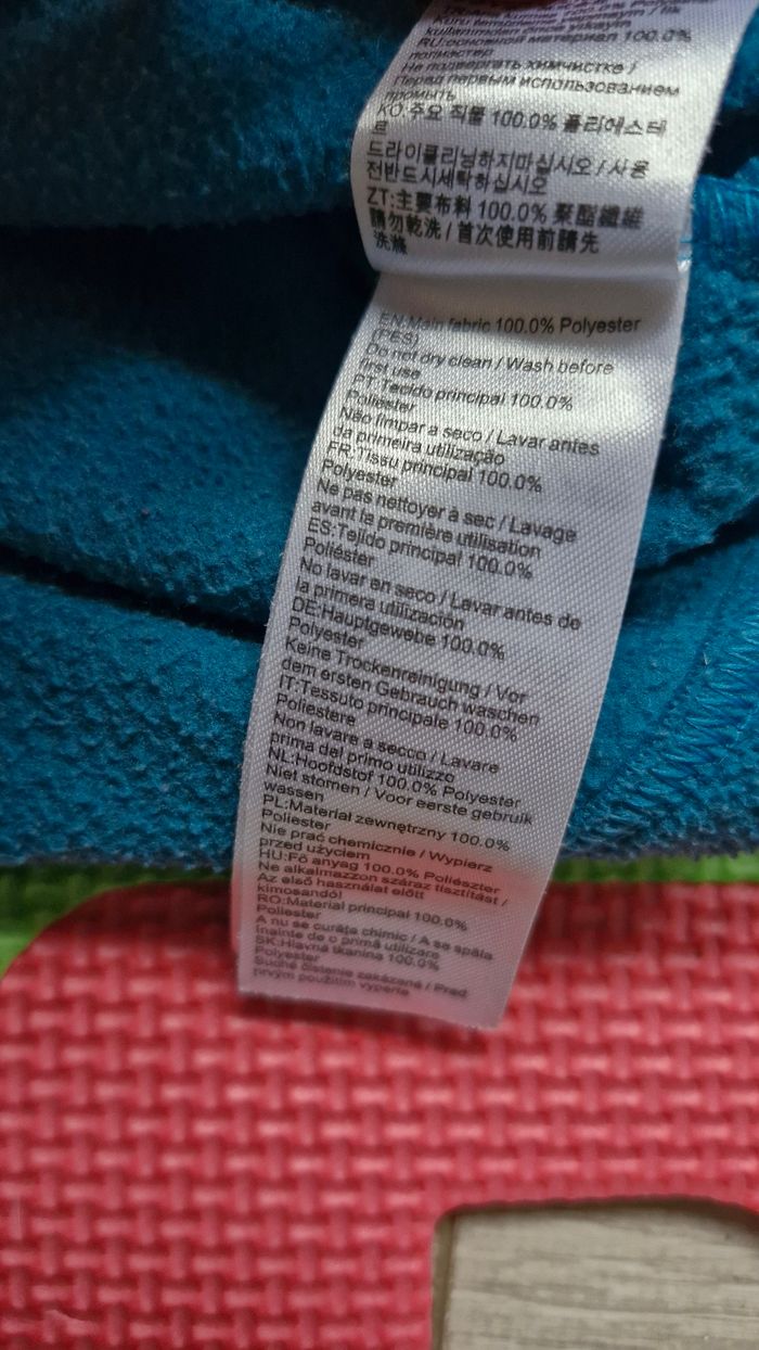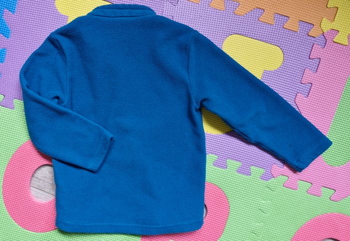 Polaire à manches longues. Coloris bleu canard (comme sur la photo 3) et vert. 100% polyester. Petite tâche bleue (voir photo 4).