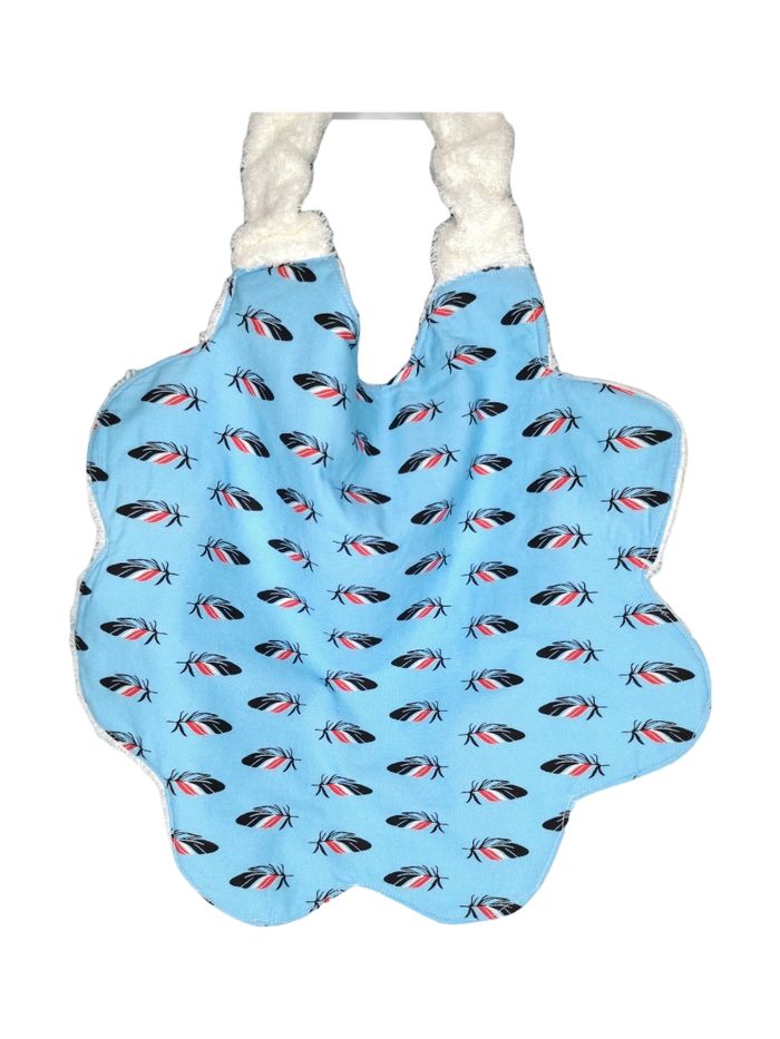 Serviette coton bleu dessins petites plumes élastique au cou doublure éponge oeko tex blanche forme fleur ✨️ destockage boutique artisanale ✨️ pièce unique ✨️ prix 12€ ✨️ envoi rapide, soigné et bien emballé ☆ . . #serviette #enfant #plumes #bleu #cantine #lingedecuisine #bavoir #servietteélastique
