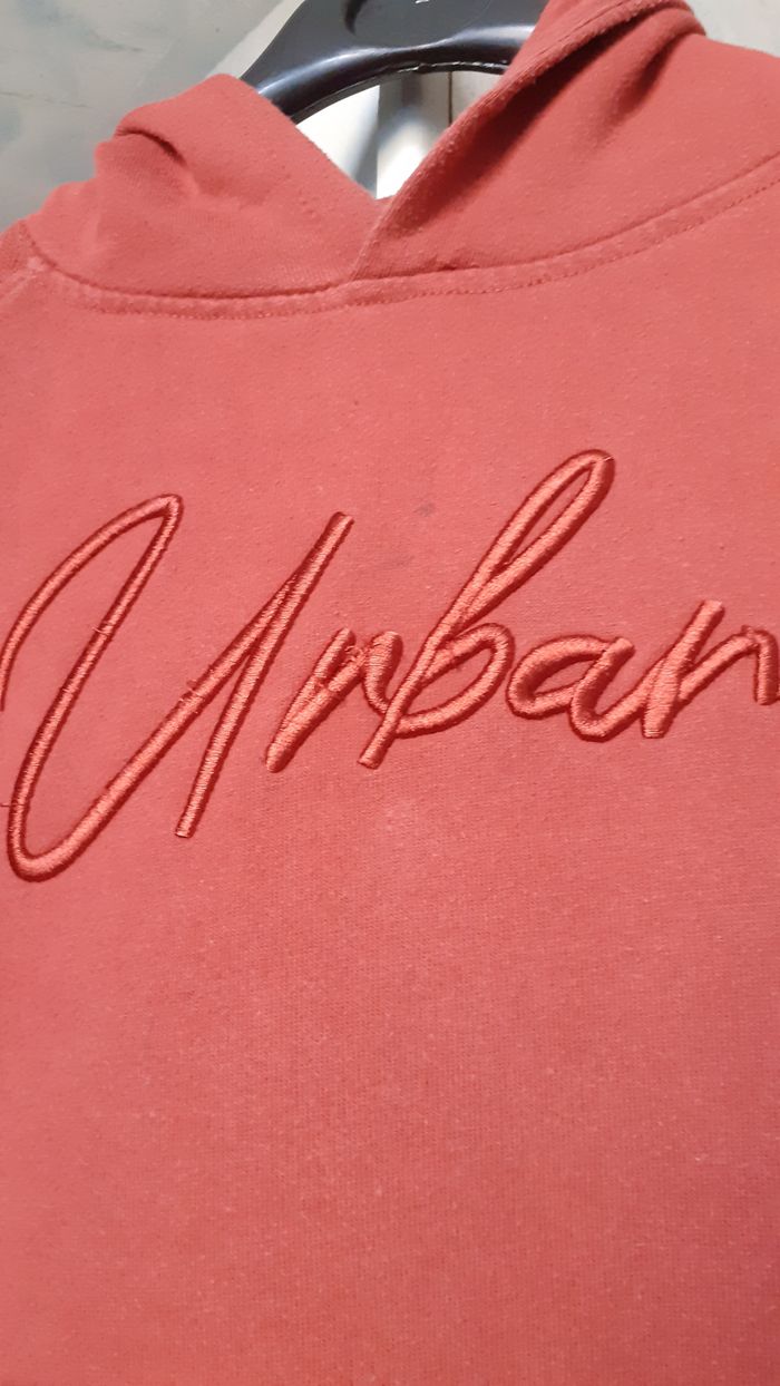 Vends un sweat à capuche 50 % coton, 50 % polyester, poche ventrale, couleur rouille, marque Primark, taille 6-7 ans sur l'étiquette mais plutôt 6 ans. Longueur de l'épaule à la base : 41 cm. A noter : les broderies devant sont un peu abîmées et il subsiste quelques petites taches.
