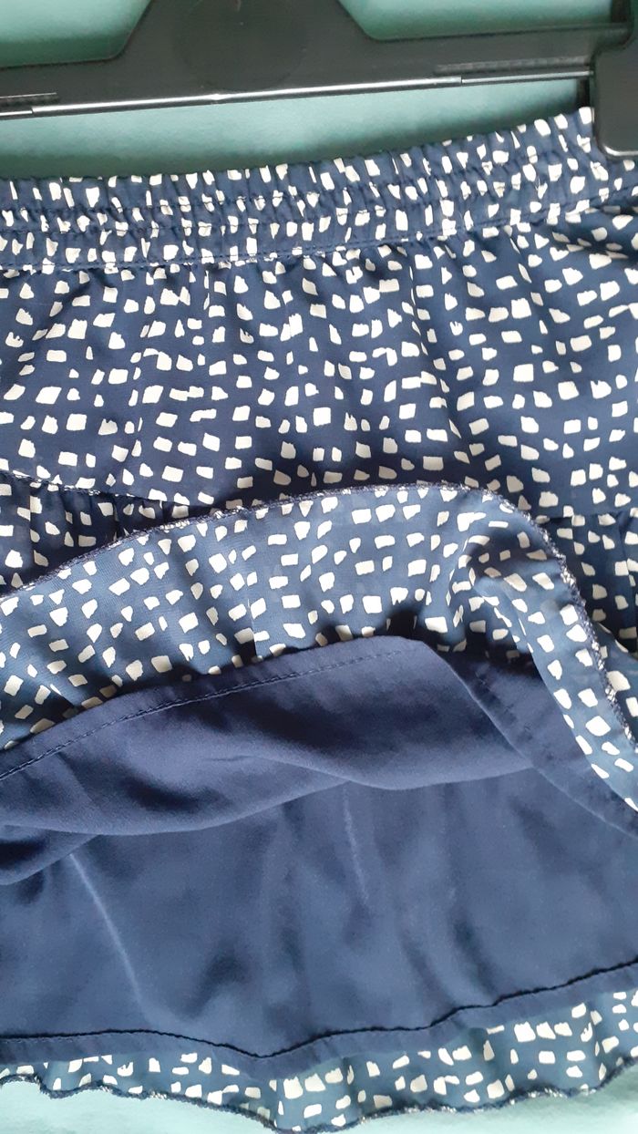 Vends une jupe à volants, 100 % polyester, doublée, ceinture toute élastique, couleur bleu marine avec petits carrés beige, marque Zeeman, taille 6-7 ans. Longueur : 29 cm.