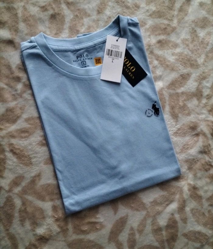 T-shirt ralph lauren Uni logo brodé Couleur bleu clair Logo bleu marine Taille L 100% coton Envoi rapide et soigné