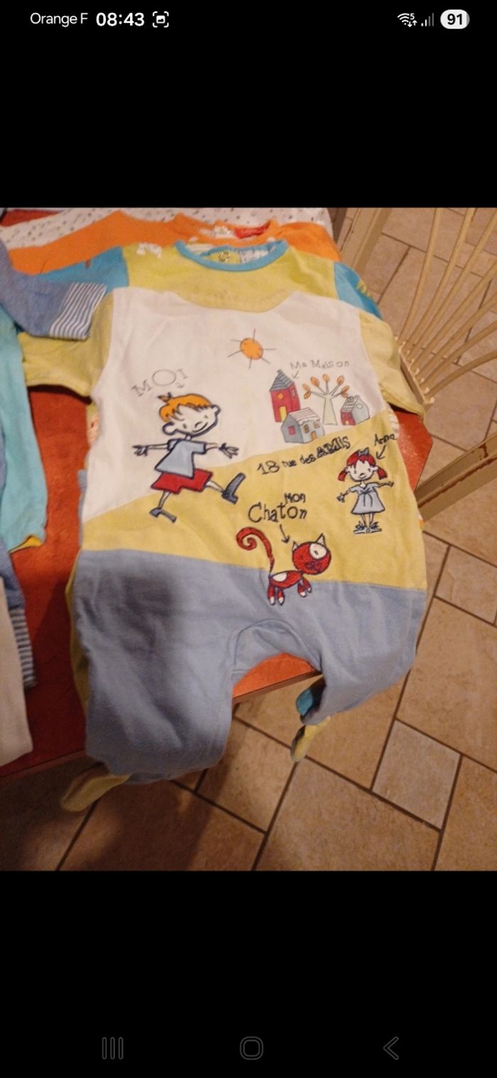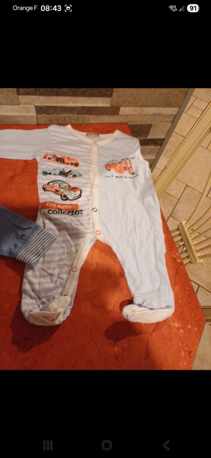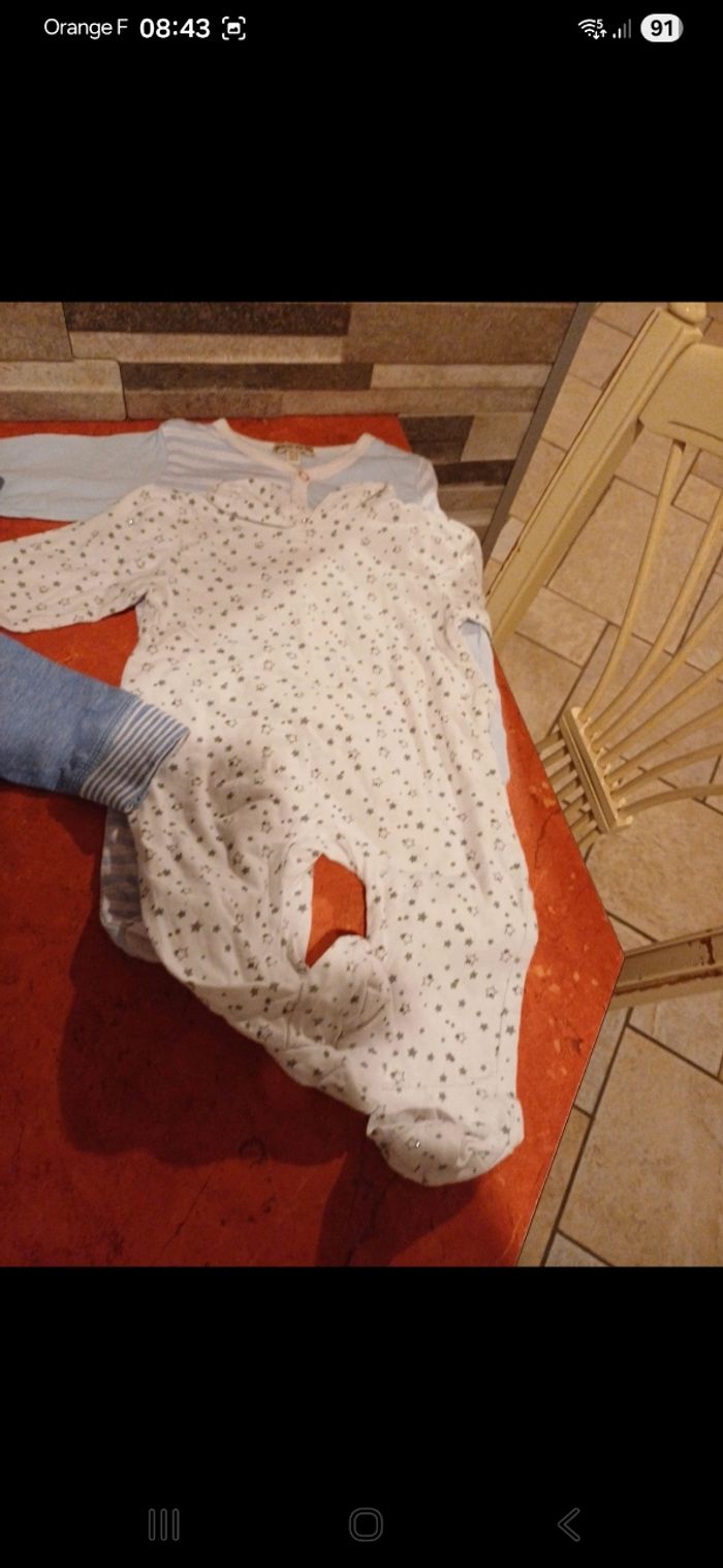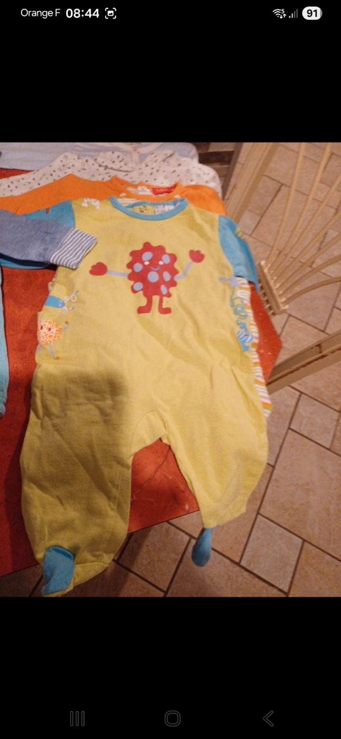 Lot de vêtements comprenant 7 bodies manches courtes 2 pyjamas fins sans pieds 6 pyjamas fins avec pieds 4 T.shirts manches courtes 1 petit pantalon 1 short 1 salopette courte 2 combinaisons d été Vous pouvez retrouver tous ces articles à l unité dans mon dressing