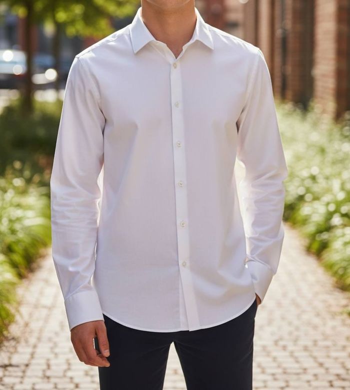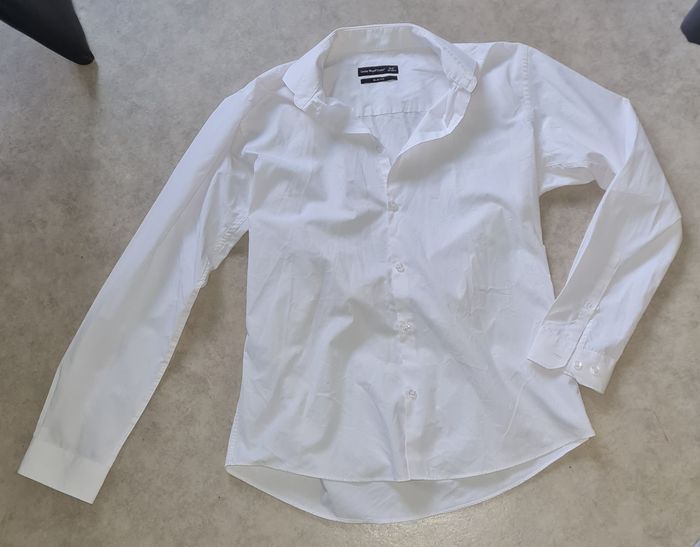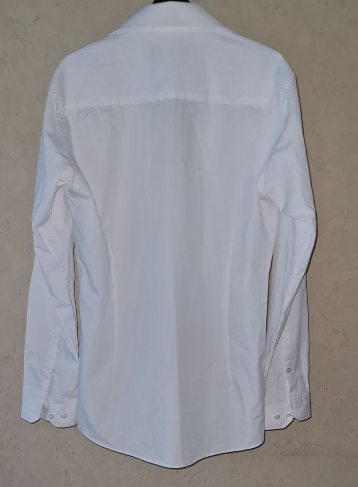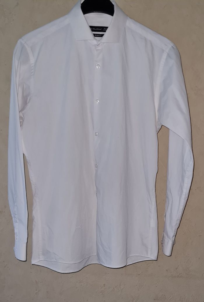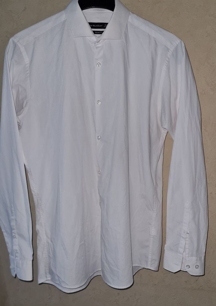 CEDAR WOOD STATE slim fit chemise blanche renforcement col manches réglables largeur avec 2 boutons longueur 74cm épaules 45cm aisselles 55cm longueur manches 63cm #lesplacardsenfoliehomme ref17