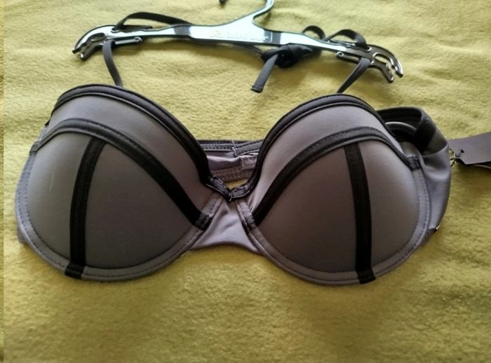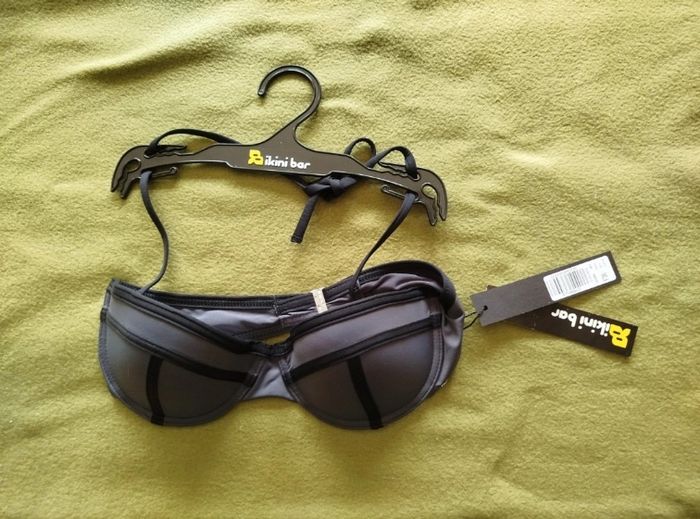 Haut de maillot de bain, forme corbeille gris et noir. Cordons à nouer dans la nuque amovibles. Neuf avec étiquette. Bikini Bar, taille 36. G79