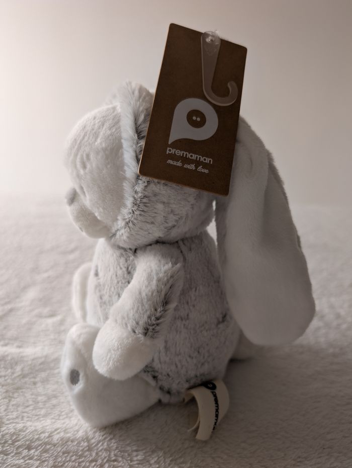 Peluche Musicale Lapin Gris clair et Blanc En tirant sur la queue du lapin, la peluche fait de la musique douce type berceuse bébé (voir 5ème photo) État Neuf avec étiquette Taille 30 cm Marque Premaman Orchestra Valeur en magasin 20 euros #peluche #doudou #lapin #musique