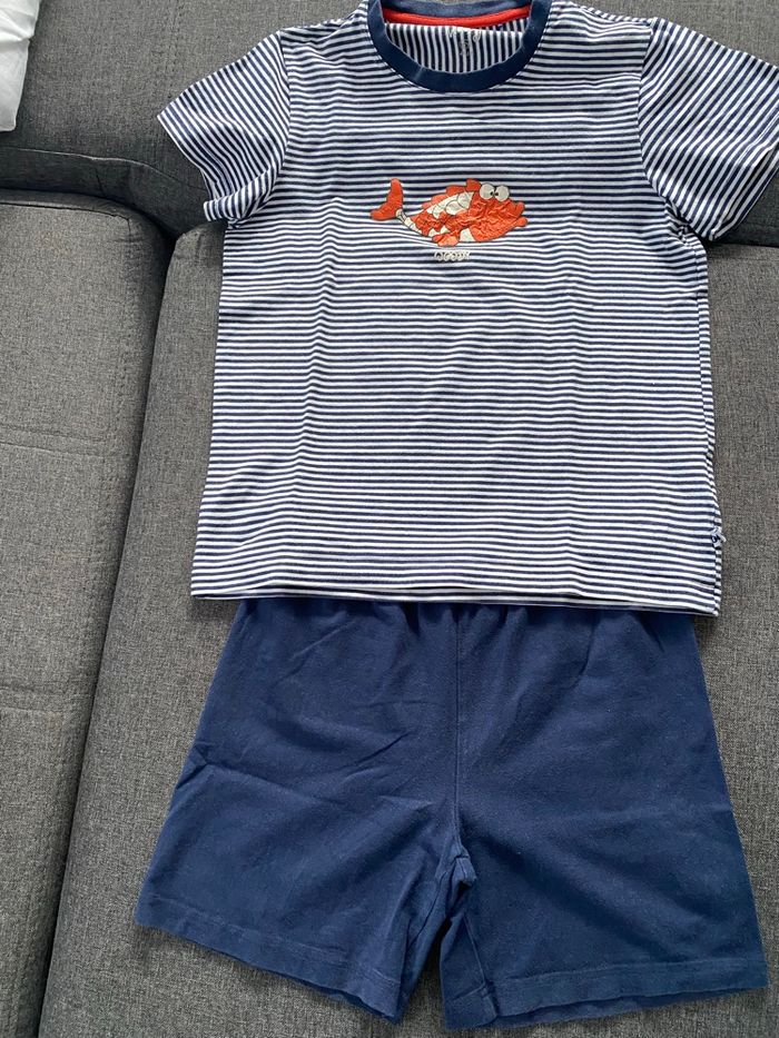 Je vends cet ensemble short pour enfant garçon composé d'un t-shirt rayé bleu marine et blanc avec un imprimé de poisson orange, et d'un short bleu marine. - Type de produit : Ensemble short - Univers : Enfant - Sexe : Garçon - Marque : Autre - Taille : 10 ans / 140 cm - Couleur du t-shirt : Bleu marine et blanc rayé - Couleur du short : Bleu marine - Caractéristiques du t-shirt : Imprimé de poisson orange - Lavé et repassé N'hésitez pas à me contacter pour plus d'informations ou de photos.