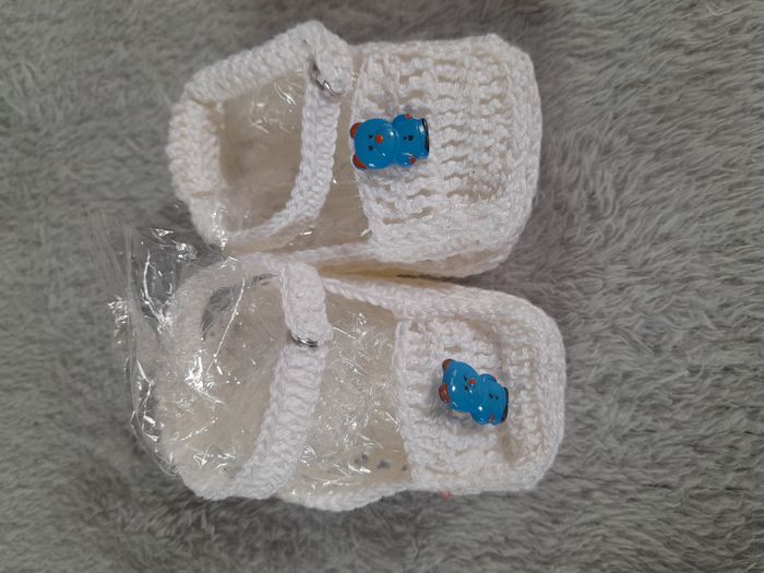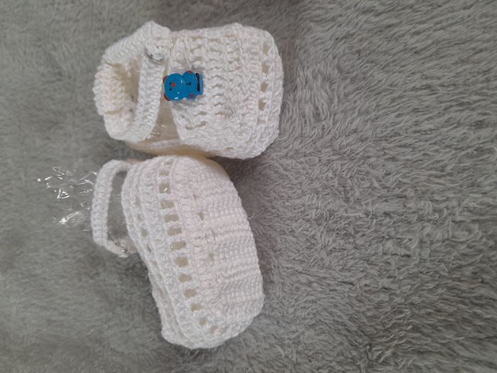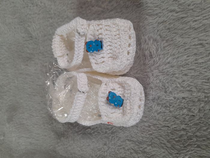 Chausson, avec ourson bleu en déco sur le dessus, attache bouton pression, pour la pointure se référer au mesure Matière : 100 % Coton Marque : Fait main au crochet