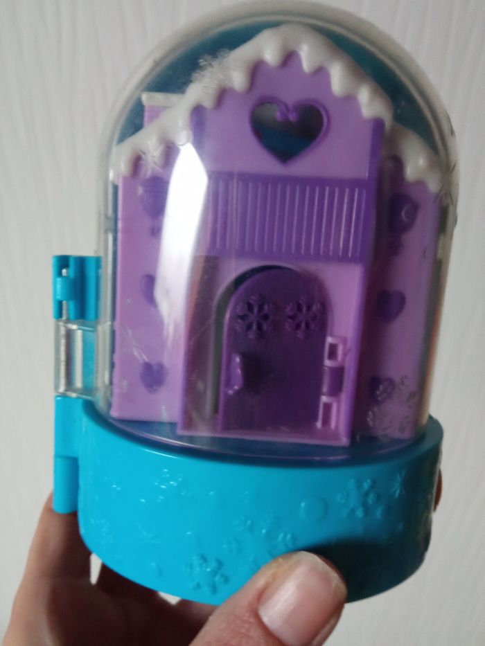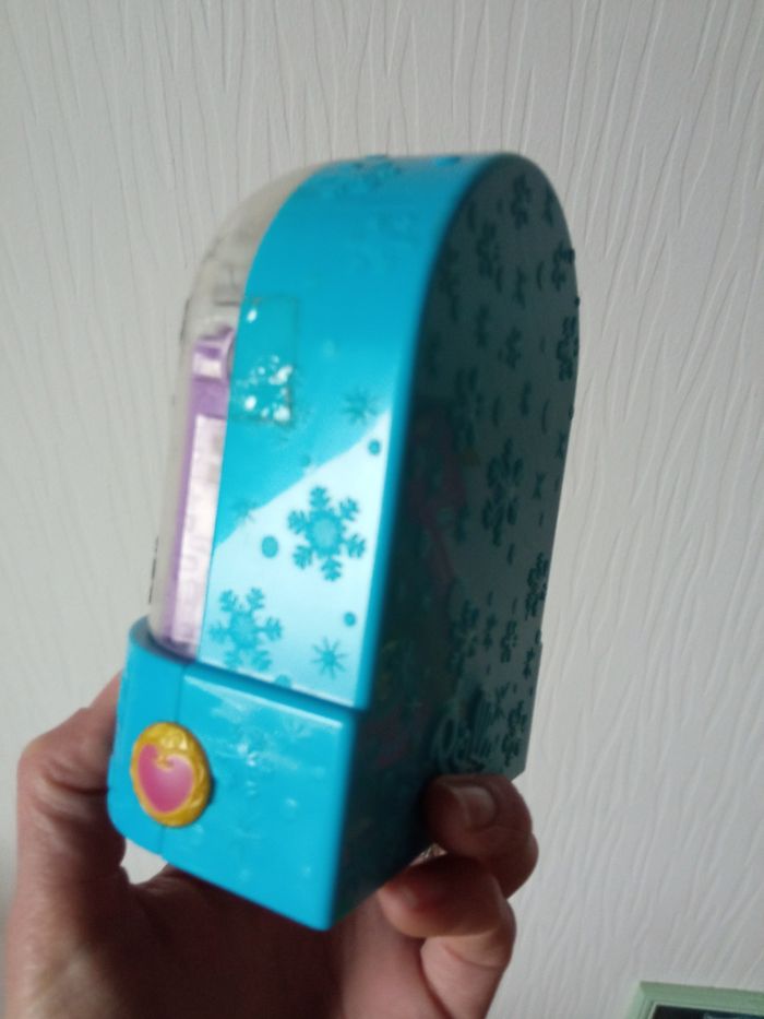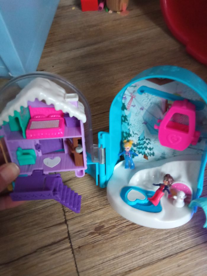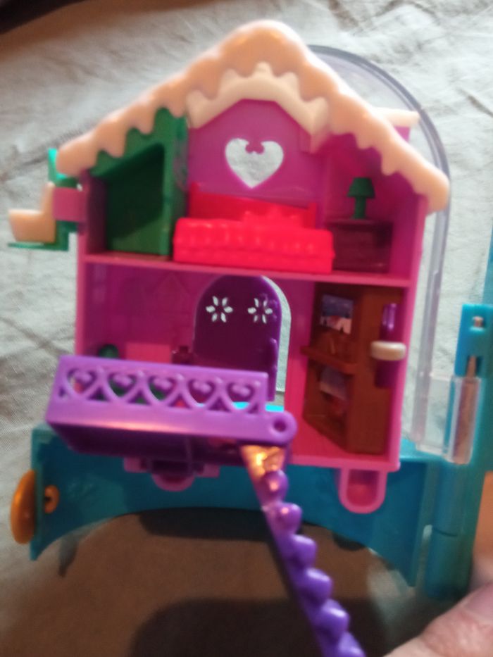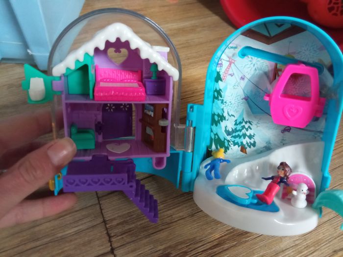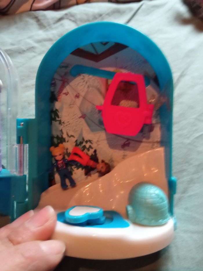 En très bon état Si on tourne le bonhomme de neige poly poket fera du patin à glace ou y a le cœur Le feu de cheminée s'ouvre et se ferme