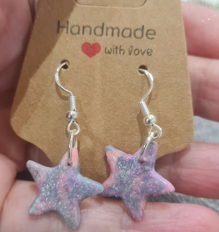 Boucles d’oreilles en forme d’étoile, fabriquées à la main en pâte polymère. Couleurs pastel (rose,gris) avec effet pailleté scintillant. Très légères et agréables à porter. Crochets couleur argent.