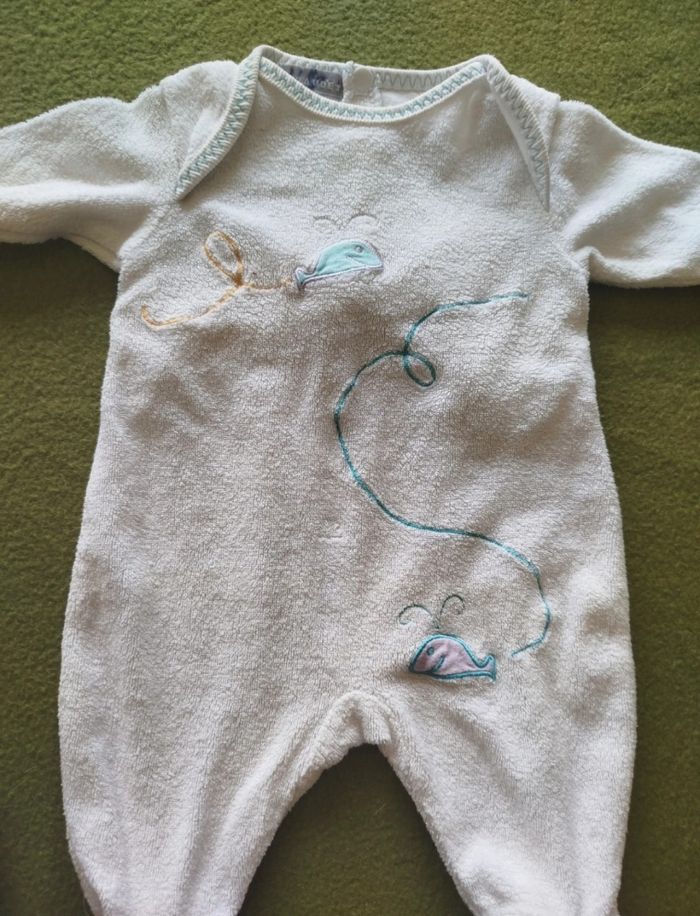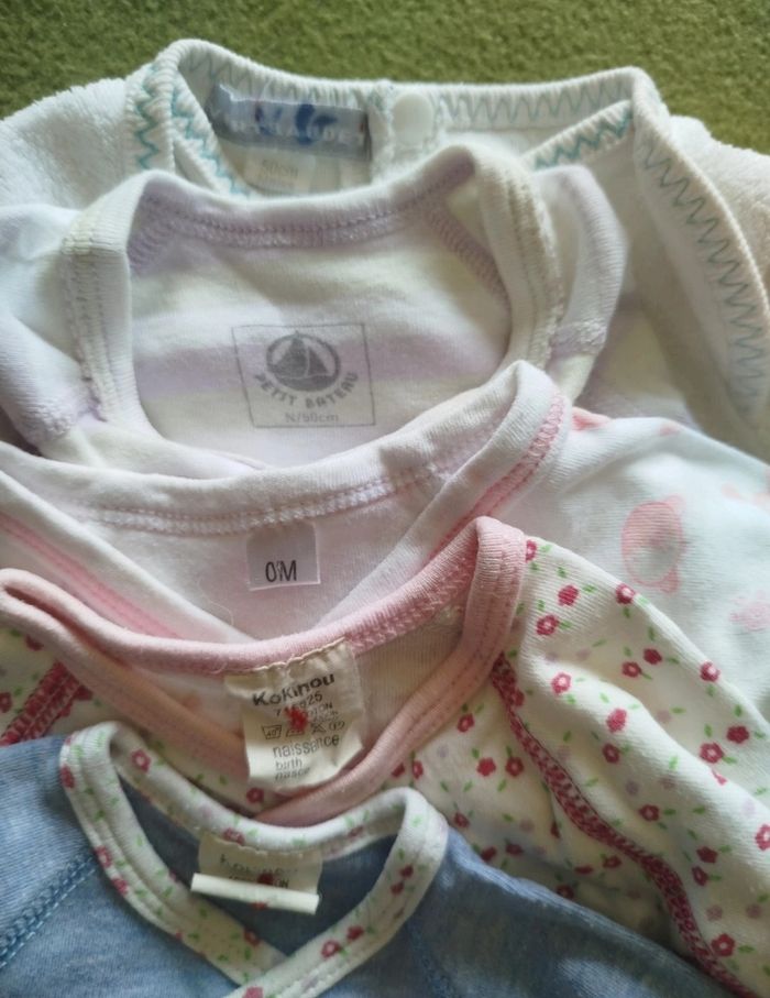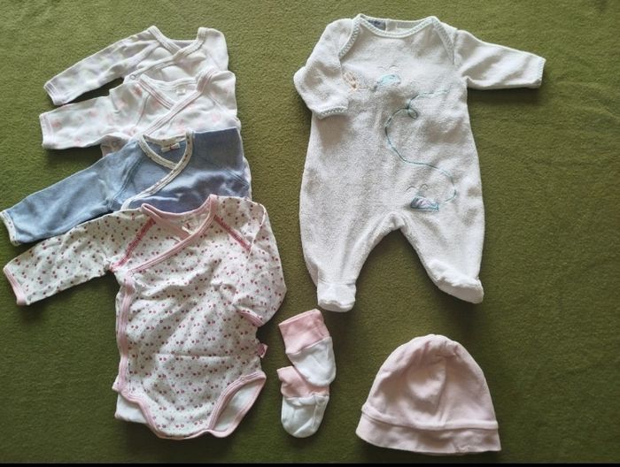 Lot de 7 pièces taille naissance. . 4 bodies manches longues . 1 pyjama velours . 1 bonnet . 1 paire de moufles Diverses marques : Obaïdi, Vertbaudet, Petit bateau, Kokinou... G309 Lot 1