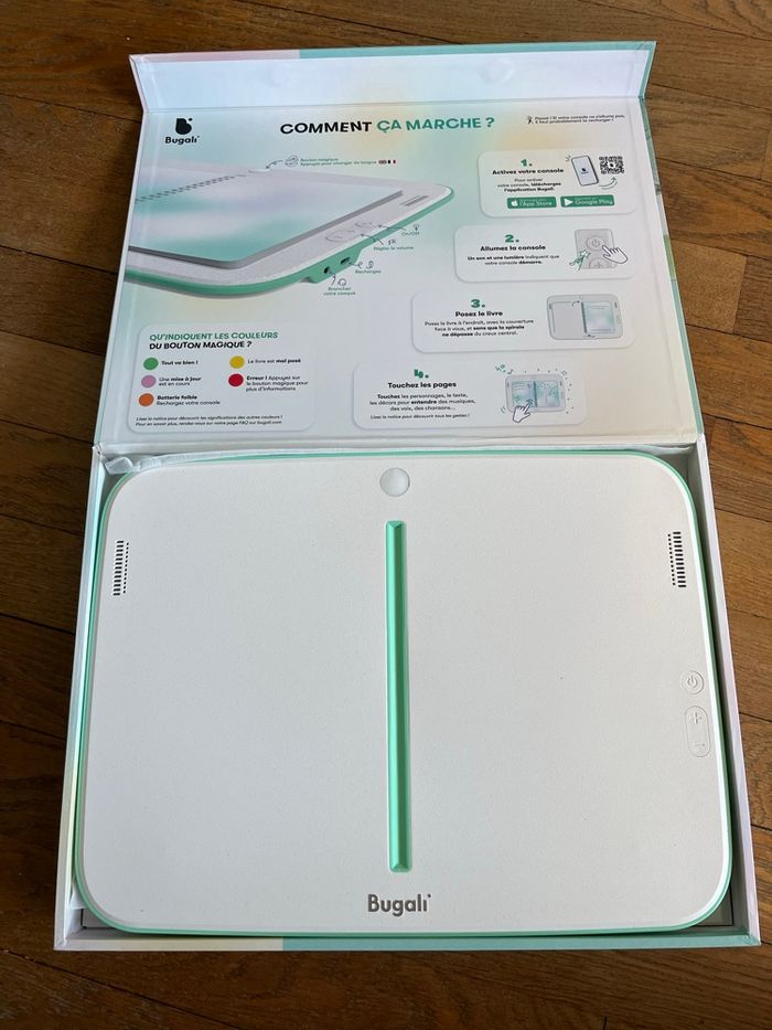 Tablette Bugali quasi neuve avec deux livres (paco et la fanfare et minusculette) encore sous garantie (achat en novembre 2025). N’a servi que pour l’installation des livres et ma fille a essayé une seule fois mais finalement elle est trop jeune (2 ans / offert à Noël) et n’est pas assez délicate. Je préfère lui retirer et faire des heureux plutôt que ça reste dans le placard jusqu’à ce qu’elle soit plus grande 🙃 nous rachèterons une Bugali quand elle sera plus grande Tout fonctionne parfaitement puisque nous (parents) avons installé et essayé plusieurs livres