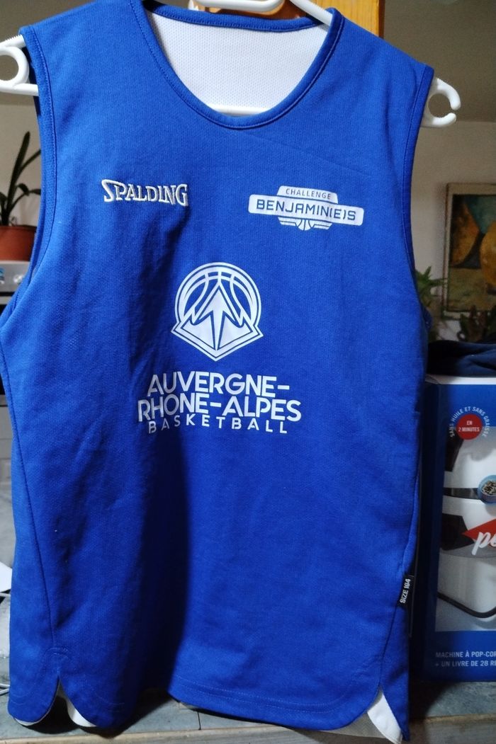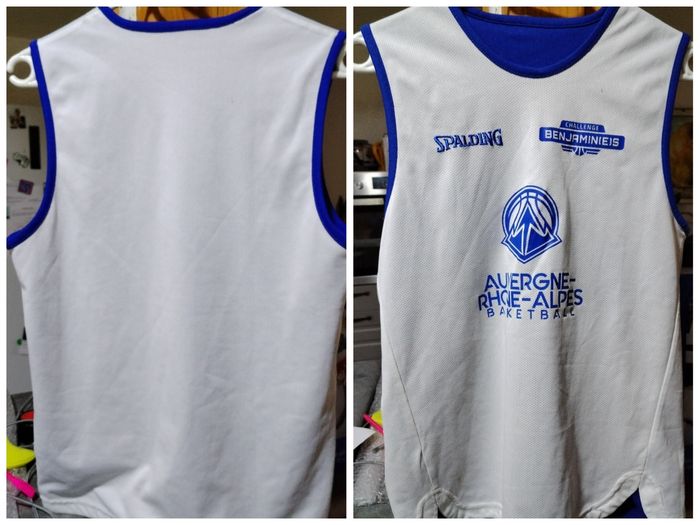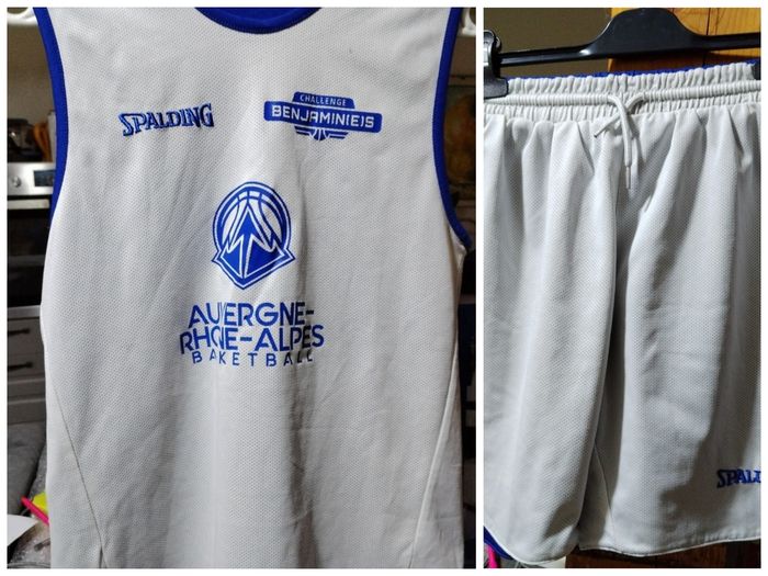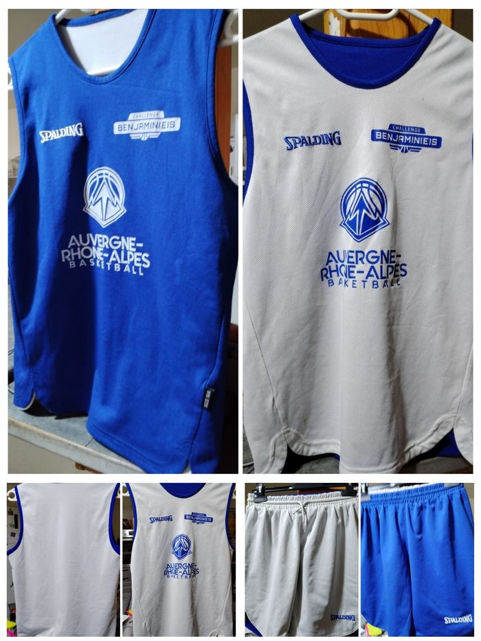 Ensemble sport réversible pour les couleurs, côté blanc et côté bleu de taille 14 ans environ, façon débardeur et short basket ou autre sport adapté pour ce genre de vêtements. Assez épais et assez chaud. De la marque spalding. Voir les photos pour détails.