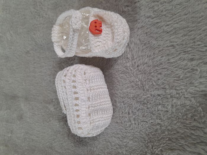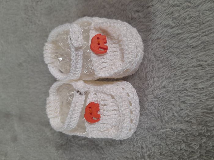 Chausson, avec petit éléphant orange en déco sur le dessus, attache bouton pression, pour la pointure se référer au mesure Matière : 100 % Coton Marque Fait main au crochet
