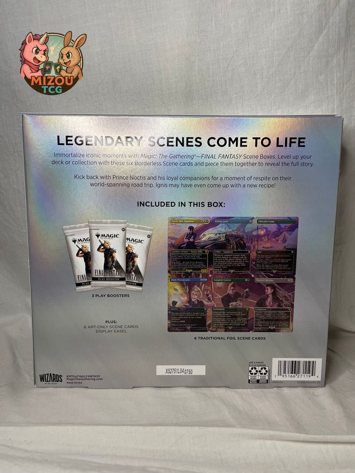 🏕️ Scene Box Magic: The Gathering × Final Fantasy XV - Camp Comrades Produit scellé, version anglaise. 📦 Contenu de la boîte : - 6 cartes scéniques sans bordure Premium foil (Traditional Foil Borderless) - 6 cartes illustration (Art-Only Cards) - 3 boosters de jeu (Play Boosters) avec 14 cartes chacun - 1 chevalet de présentation en papier 🎴 Carte légendaire incluse : Noctis, Heir Apparent avec sa capacité Warp Strike emblématique + artefact Fishing Gear. Les 6 cartes scéniques s\'assemblent pour révéler une scène iconique de FFXV : le camp de repos avec Noctis, Ignis, Gladiolus et Prompto. Chaque Play Booster contient 1-4 Rares ou Mythiques, 3-6 Uncommons, 6-9 Commons et 1 terrain. Une carte foil garantie par booster. 🚀 Livraison rapide 24-48h maximum Mots-clés: Magic The Gathering, Final Fantasy, FFXV, Final Fantasy XV, Scene Box, Camp Comrades, Noctis, MTG, booster, cartes foil, collectible, TCG, trading card game, EN, anglais, version anglaise
