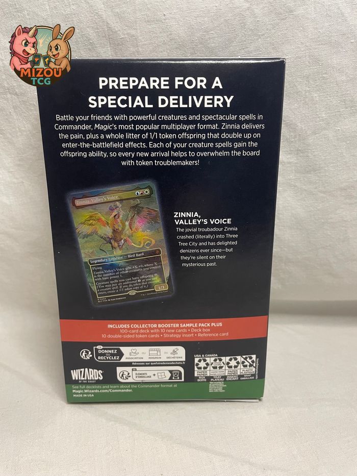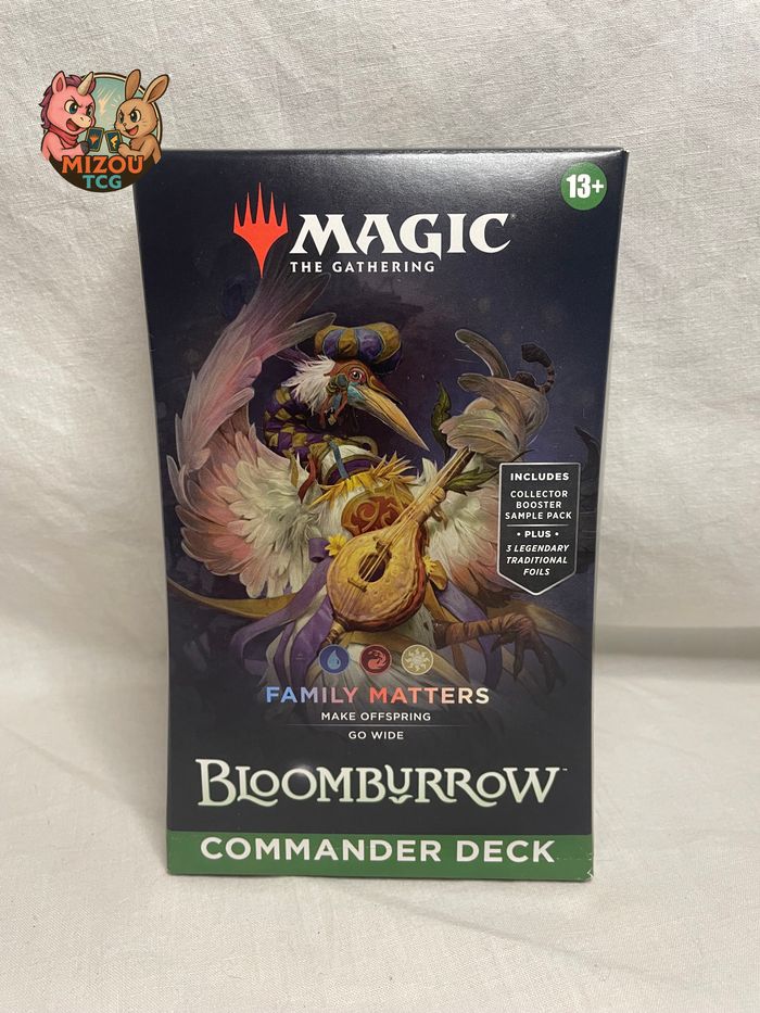 Mots-clés: Magic The Gathering, MTG, Commander Deck, Bloomburrow, Family Matters, Liens Familiaux, Zinnia, Offspring, Progéniture, tokens, deck préconstruit, precon, anglais, EN, English, Bleu Rouge Blanc, jeskai, foil, collector booster, sample pack, cartes inédites, commander, EDH, wizards of the coast, TCG