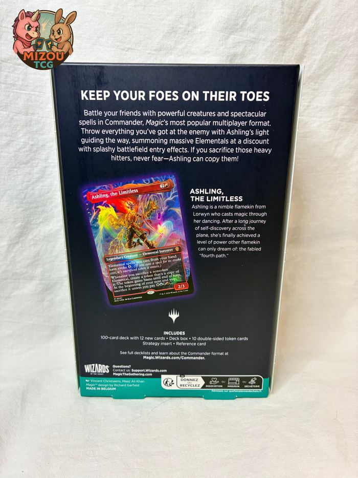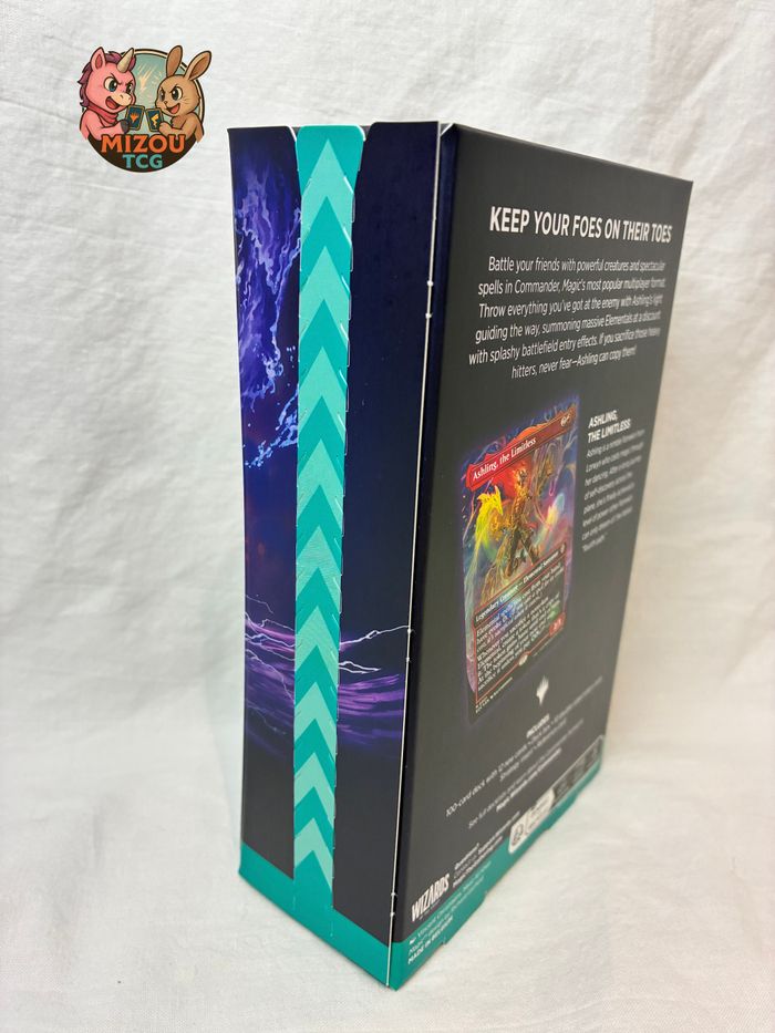 Deck Commander Magic: The Gathering - Dance of the Elements Extension: Lorwyn Eclipsed Version anglaise (English) Contenu complet: - 100 cartes prêtes à jouer - 2 commandants mythiques foil borderless (Ashling, the Limitless et Mass of Mysteries) - 12 cartes nouvelles exclusives - 10 jetons double-face - 1 boîte de rangement - 1 carte de référence Caractéristiques du deck: - Format: Commander (EDH) - Couleurs: 5 couleurs (WUBRG) - Thème: Élémentaux avec mécanique Evoke - Réimpressions premium: Endurance, Fury, Selvala Heart of the Wilds État: scellé 🚀 Livraison rapide 24-48h maximum Mots-clés: Magic The Gathering, MTG, Commander, EDH, Dance of the Elements, Danse des Elements, Lorwyn Eclipsed, Ashling the Limitless, Mass of Mysteries, Elemental, Evoke, precon, deck preconstruit, anglais, english, 5 couleurs, WUBRG, cartes foil