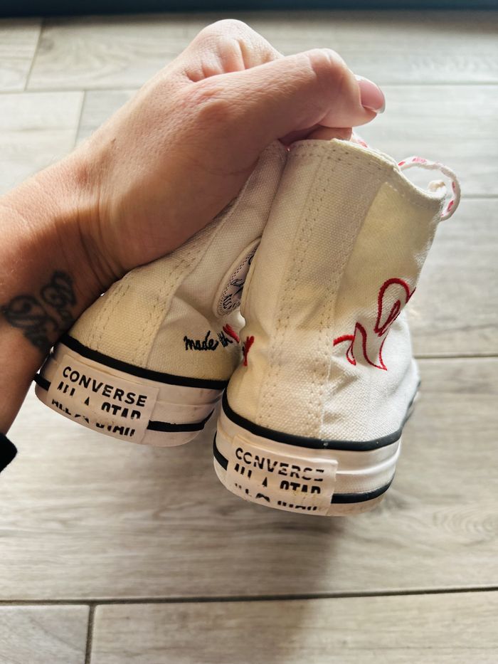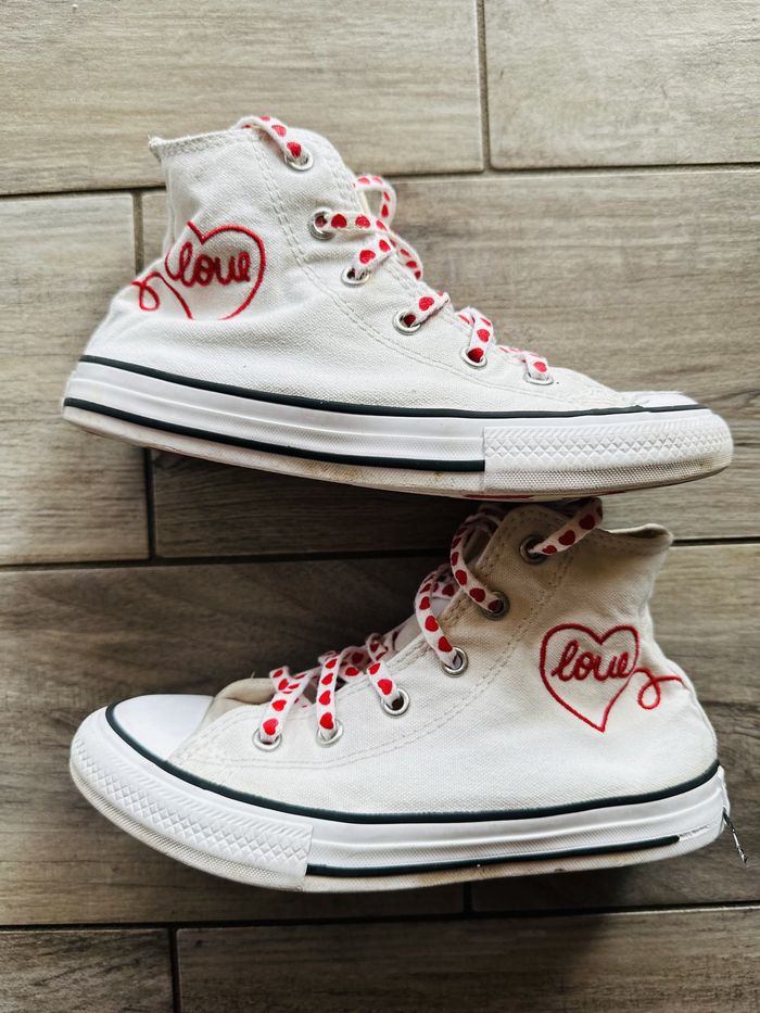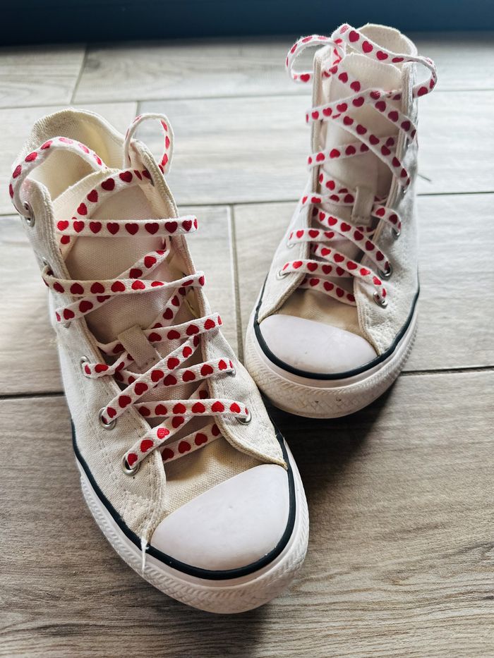 Magnifique paire de converses crème détails coeurs lacets, semelle... Très bon état juste quelques petites taches peu visible (voir photos) #converses #conversescoeurs #coeurs #conversescoeurs33 #converses33