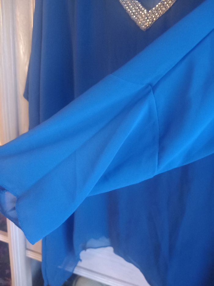Tunique femme Marqué fabriqué en France Motifs avec strass et transparent Avec col V Couleurs bleu et gris Matière 100% polyester Taille 42/44 Dimensions approximative 74cm de long : largeur sous aisselles 60cm : largeur d'épaules 46cm : longueur de manches 54cm En très bon état