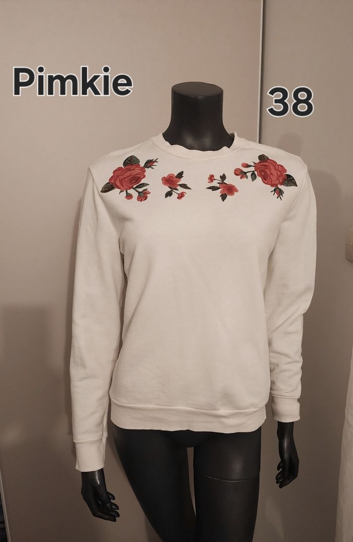 Collection Pimkie. Blanc avec roses brodées. Taille 38. Ses dimensions : longueur totale 60 cm, largeur sous aisselles 55 cm. Longueur des manches 59 cm. Acheté sur internet mais hélas trop petit pour moi. Il est en très bon état.