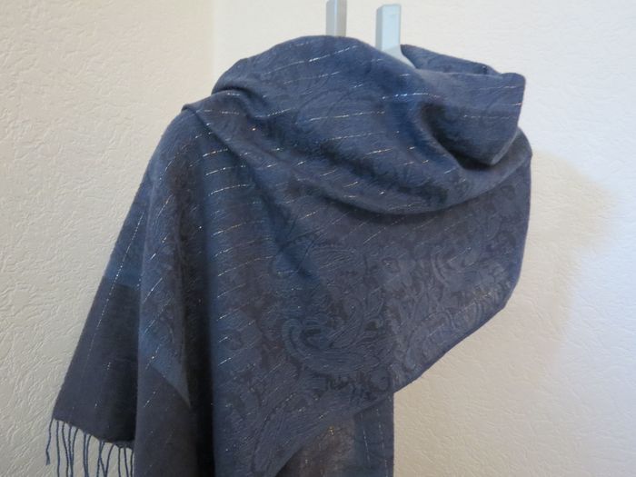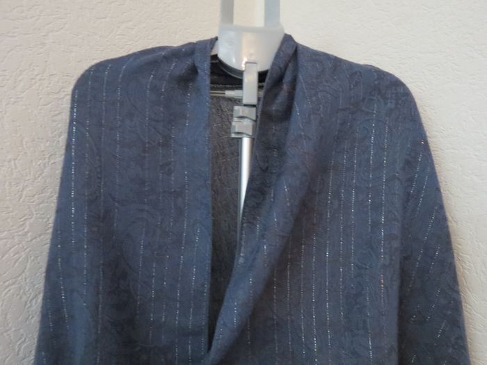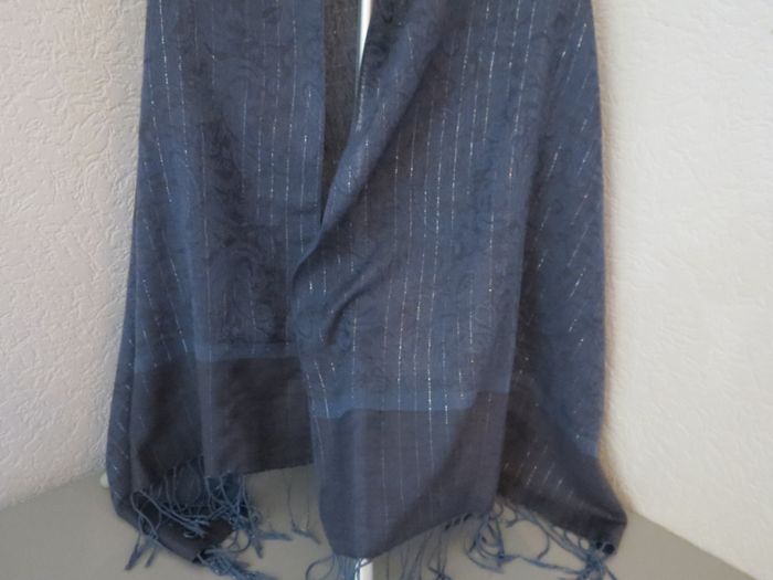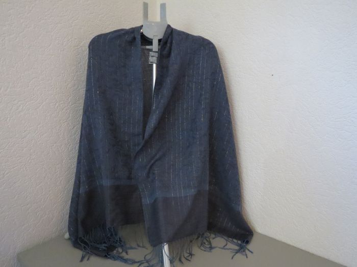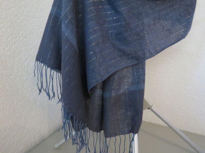 Magnifique étole aux tons bleu marine / bleu pétrole, très chic et intemporelle. Le tissu est léger et fluide, avec de fins fils brillants tissés en lignes verticales qui apportent une touche raffinée et lumineuse, sans en faire trop ✨ Motifs discrets en relief pour un rendu élégant et travaillé. ✔️ Peut se porter en écharpe, en châle ou sur les épaules ✔️ Idéale pour une tenue habillée comme pour rehausser un look plus casual ✔️ Finition avec franges pour une belle retombée 📏 Dimensions : Longueur : 174 cm (hors franges) Largeur : 70 cm 📌 État : très bon état 📌 Matière : tissu doux et agréable à porter (non épais) Un accessoire polyvalent, parfait pour la mi-saison, les soirées ou les occasions spéciales 💙