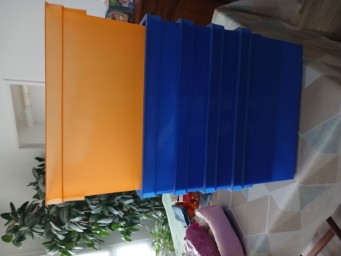 vend 5 boites de rangement en très bon état en plastique bleu et orange L 44 cm l 33 cm et H 24 cm au prix de 10 euros les 5