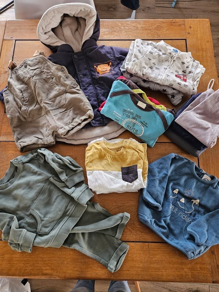 Lot 15 vêtements bébé 6 mois - 1 manteau - 2 pyjama légers - 3 pantalons - 1 salopette - 3 bodies - 2 tshirt manche courte - 1 sweat - 1 tshirt manche longue - 1 ensemble sweat pantalon Différentes marques : kiabi, verbaudet, tape à l'œil, absorba, noukies...