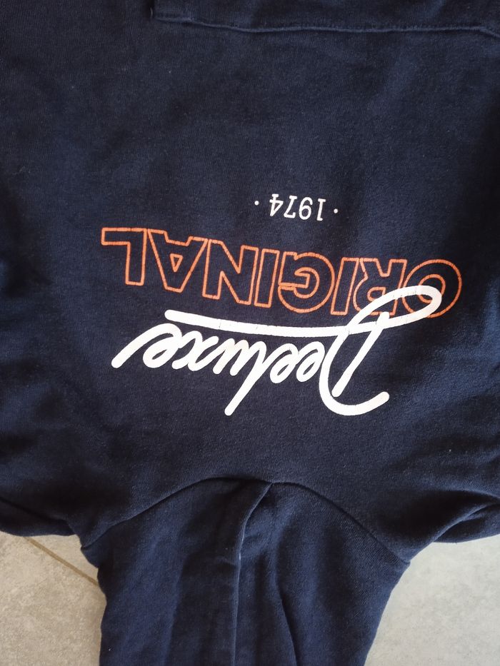 Sweat à capuche en très bon état deeluxe authentique et original voir les photos il est superbe et impeccable taille 12 ans. Couleur marine et inscription en orange et blanc