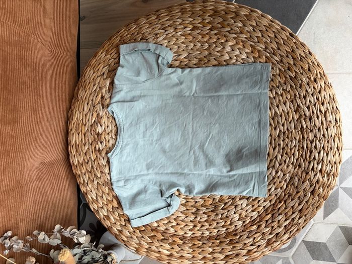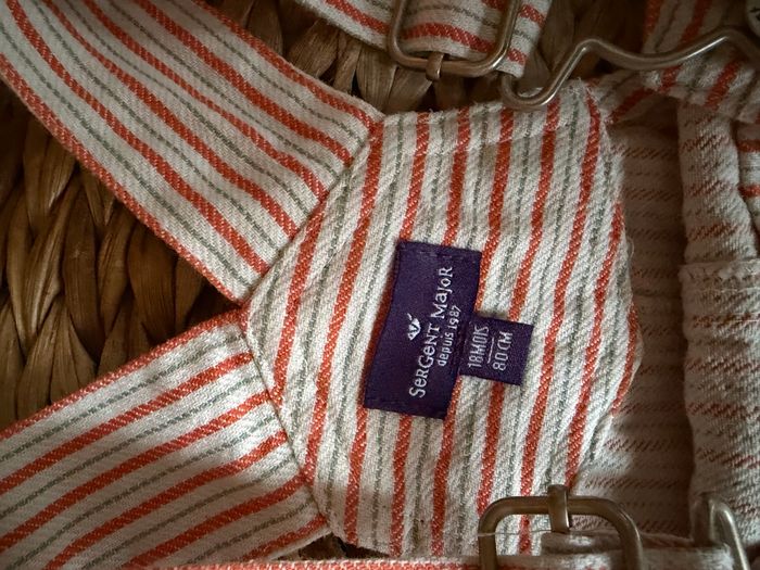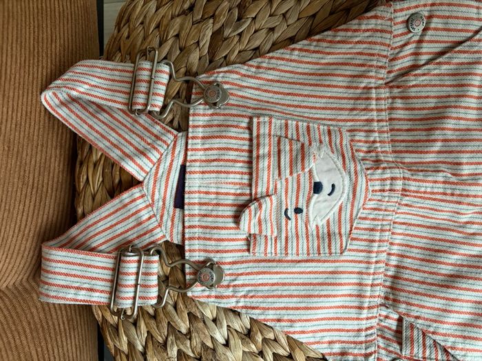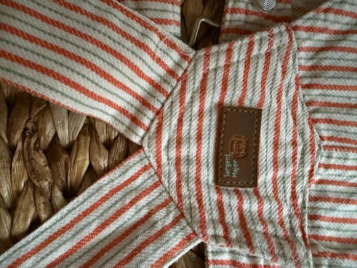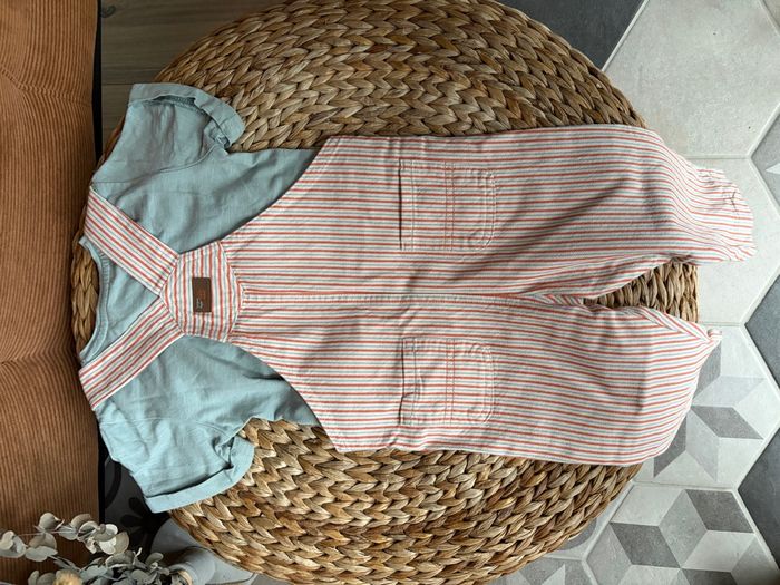 Ensemble comprenant : - un teeshirt H&M vert sauge - très bon état - une salopette rayée Sergent Major thème À la ferme - neuve juste lavée Rouge orangé / beige
