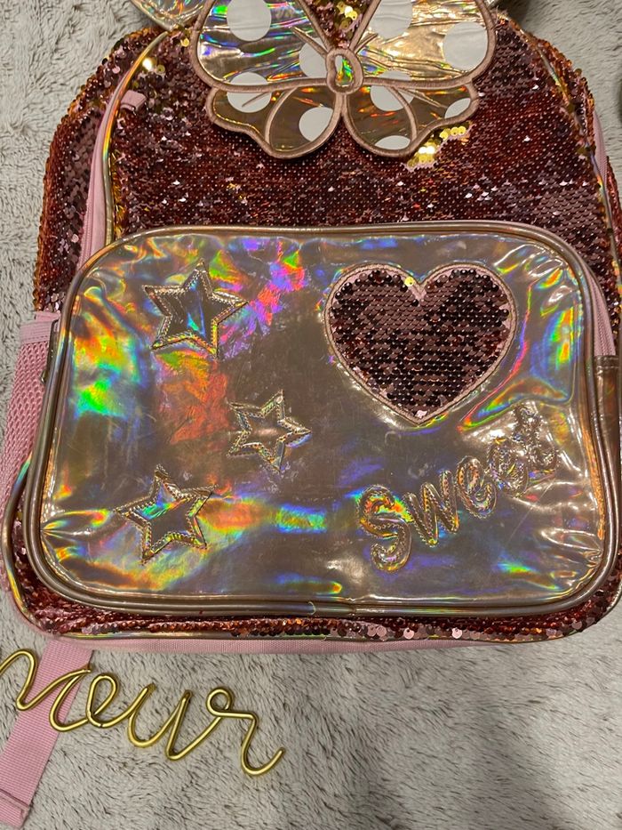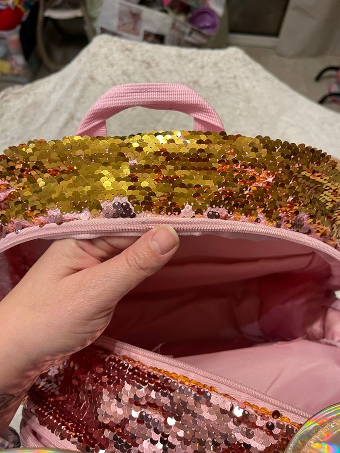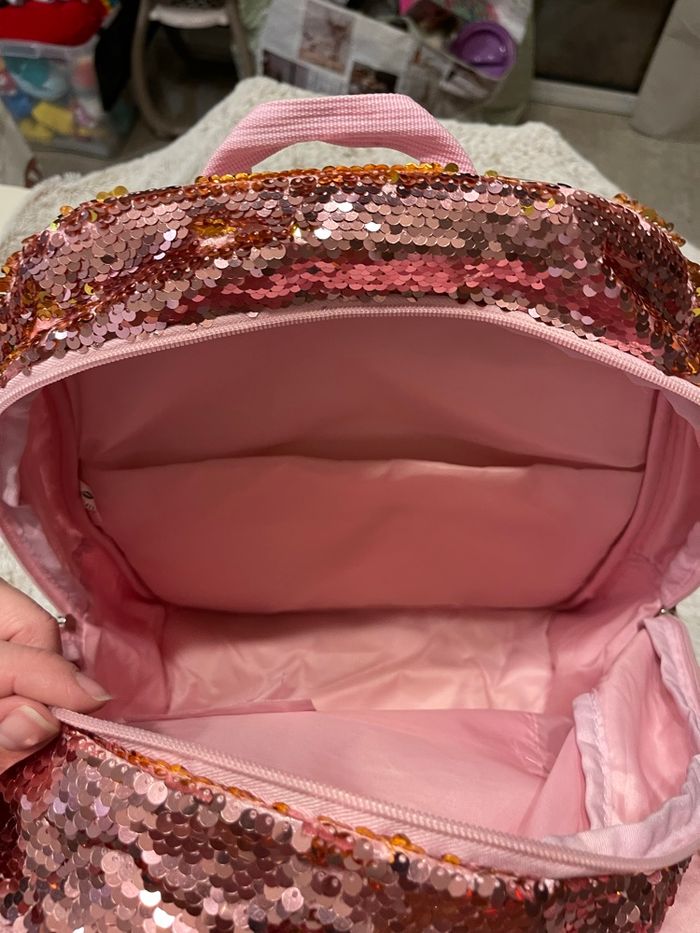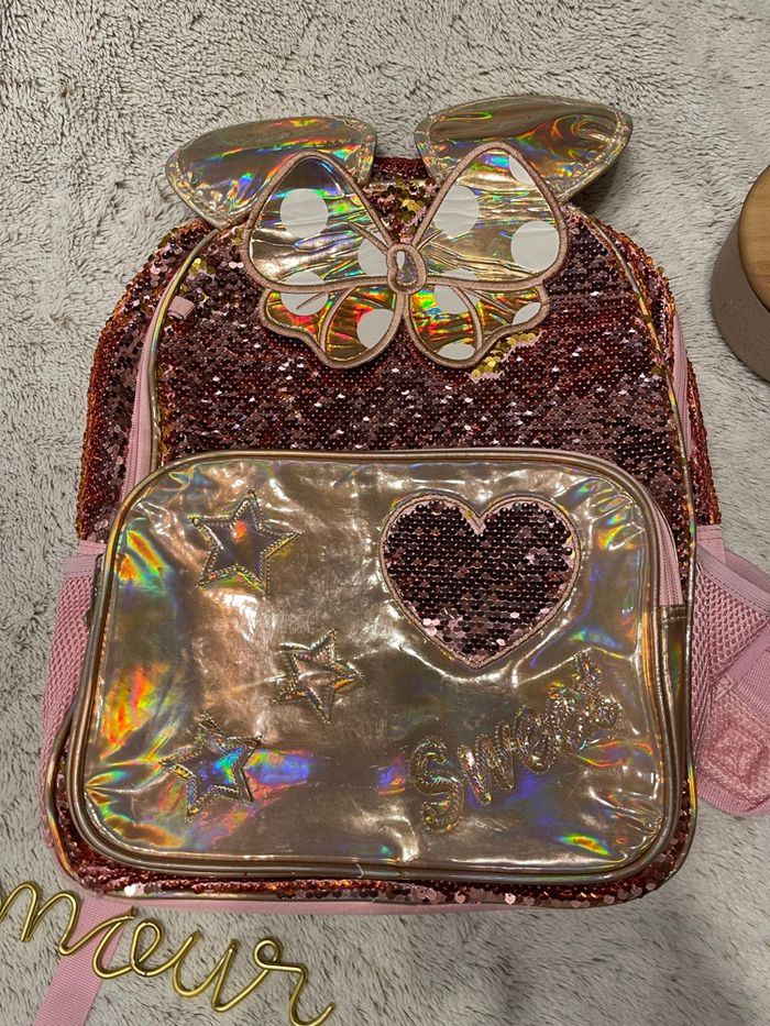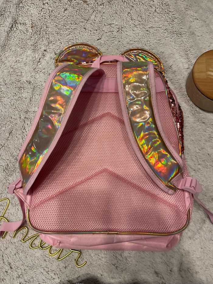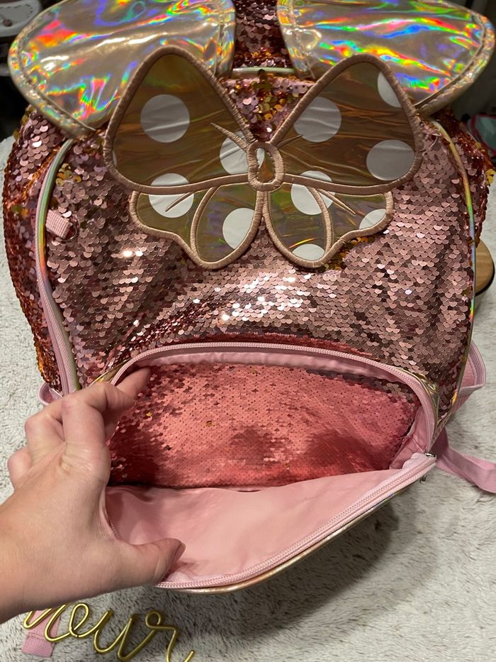 Magnifique sac à dos à paillettes rose et doré Minnie Peut convenir pour les fournitures scolaire ou autres. Il nous a servit pour allez à Disney. Acheter 69€ sur le site mon sac à dos Dimension: 28x33 cm Disney