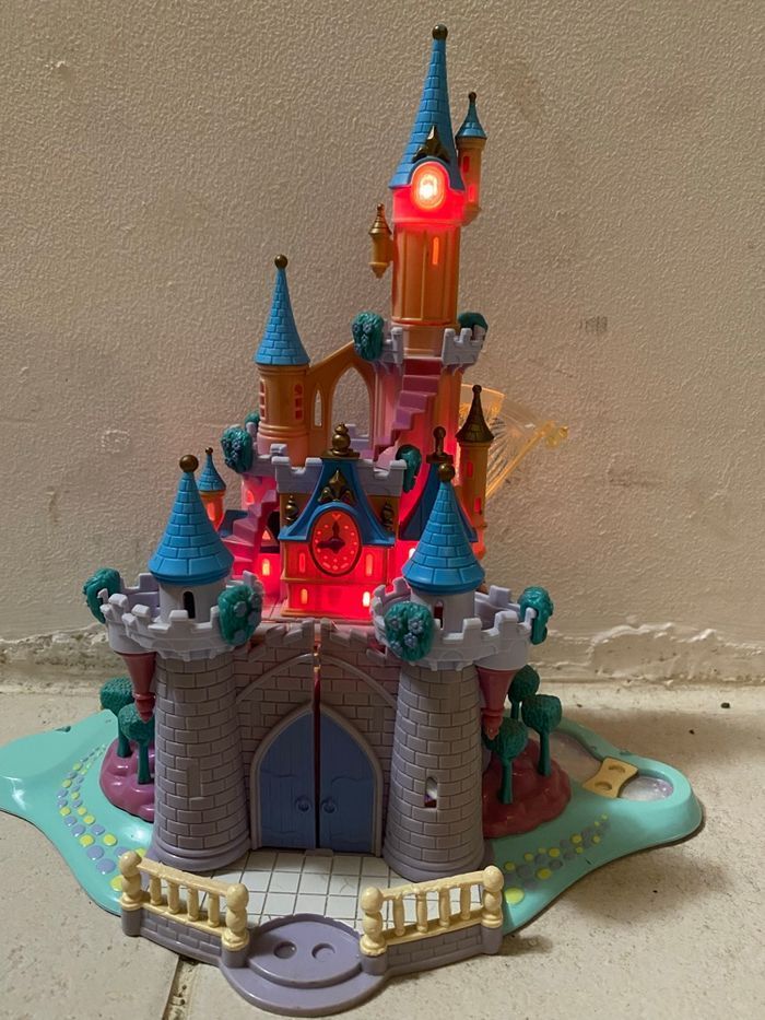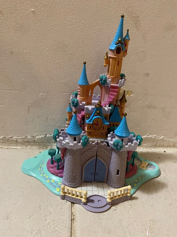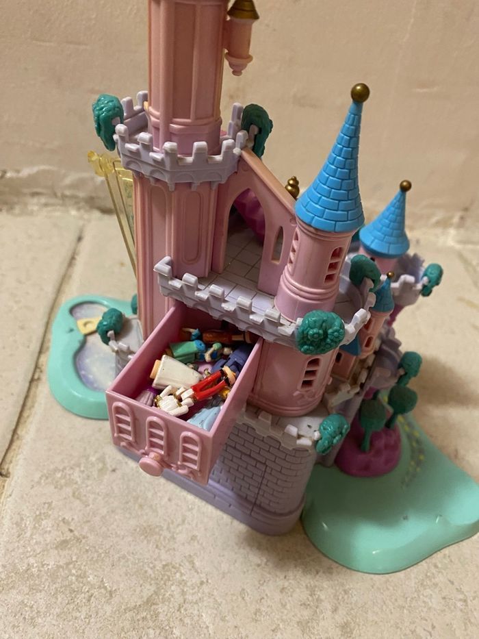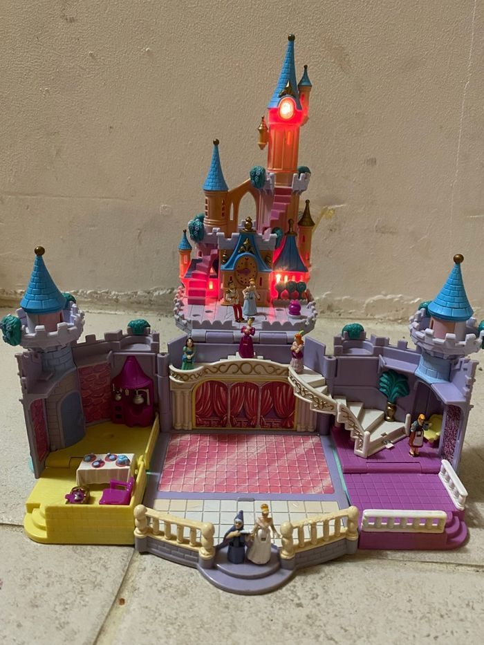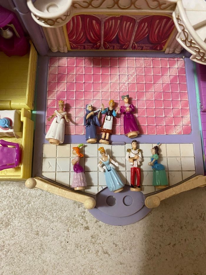 Chateau cendrillon de Polly pocket La lumière fonctionne toujours Il y a 8 personnages (la belle mère, j'avoue, Anastasie, la bonne fée, le prince, cendrillon en haillons, cendrillon en princesse et cendrillon en robe)