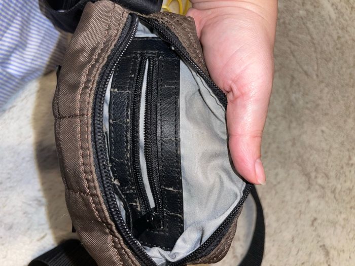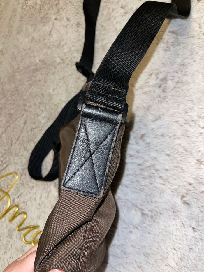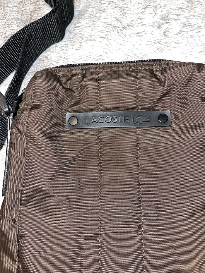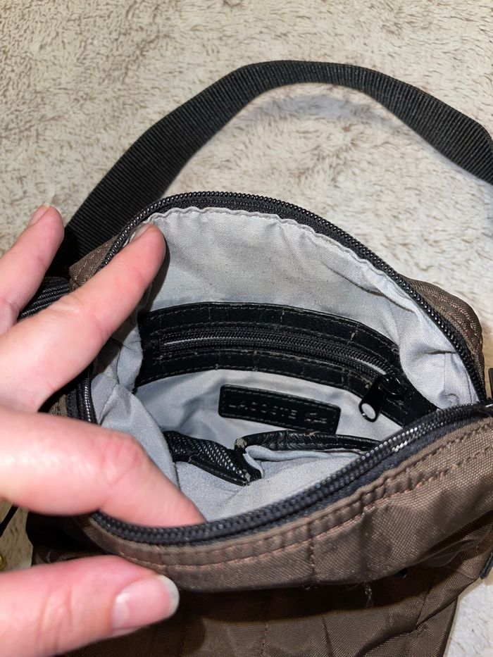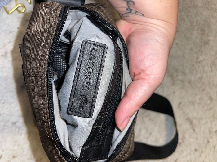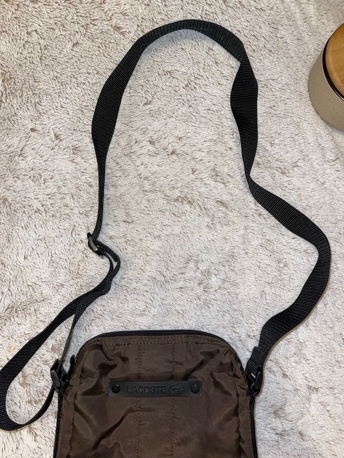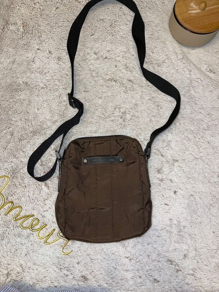 Sacoche en bandoulière en tissu matelassée marron pour homme Légèrement abîmer sur les parties en cuir noir mais ne gêne en rien dans son utilisation Lacoste
