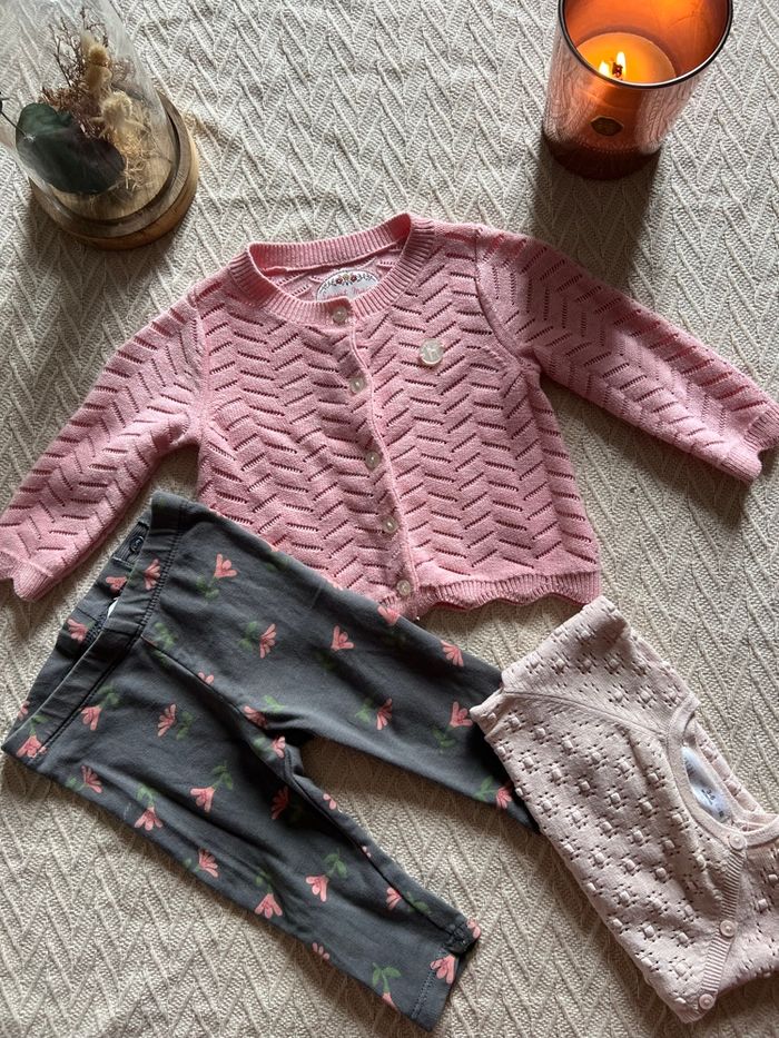 Tenu bébé fille en 6 mois, le gilet viens de chez sergent major, le legging de chez H&M et le body de chez Zara en très bonne état le body n’a jamais était porté