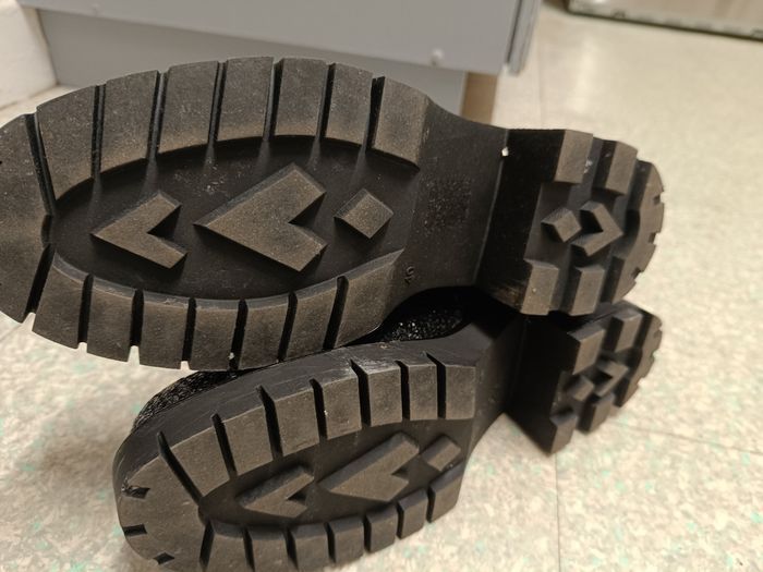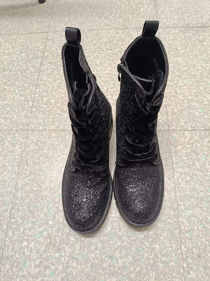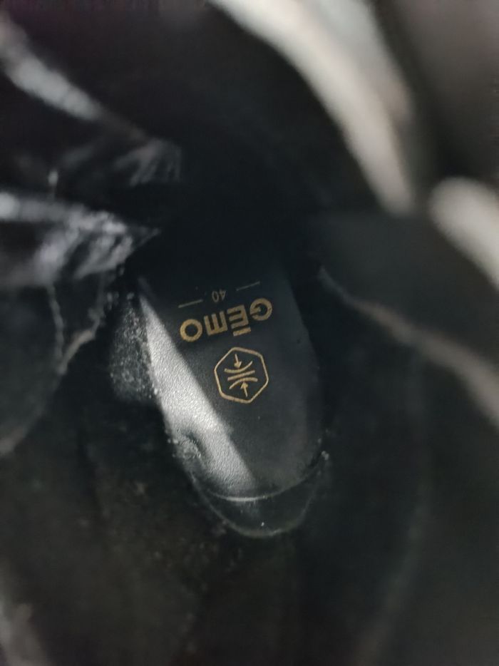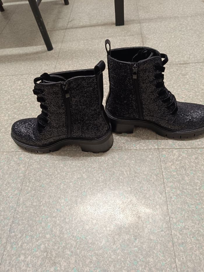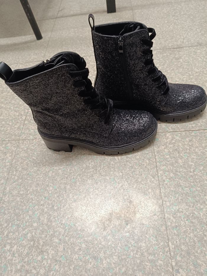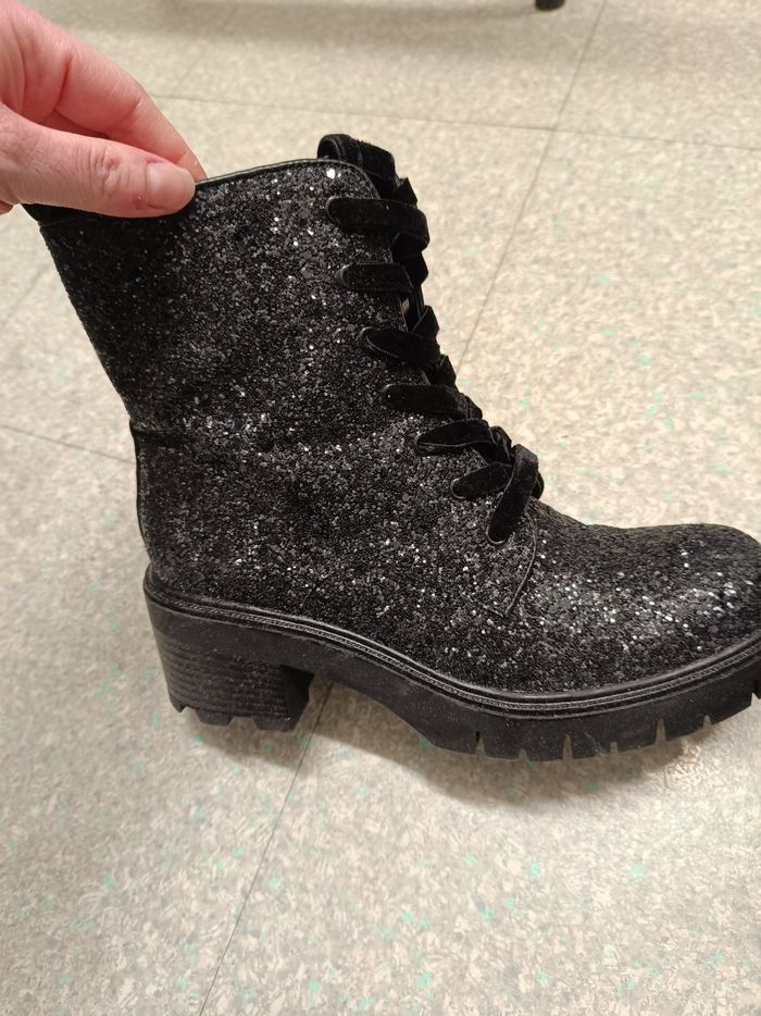 Bottine Gémo pailleter qui monte au dessus de la cheville en taille 40 mais je pense qu'en réalité c'est un taille 39 en tout cas pour un pied un peu fort mais je met 40 car c'est la taille indiqué de la chaussure Porté 1 ou 2 fois très bon état Noir pailleter Un peu de talons