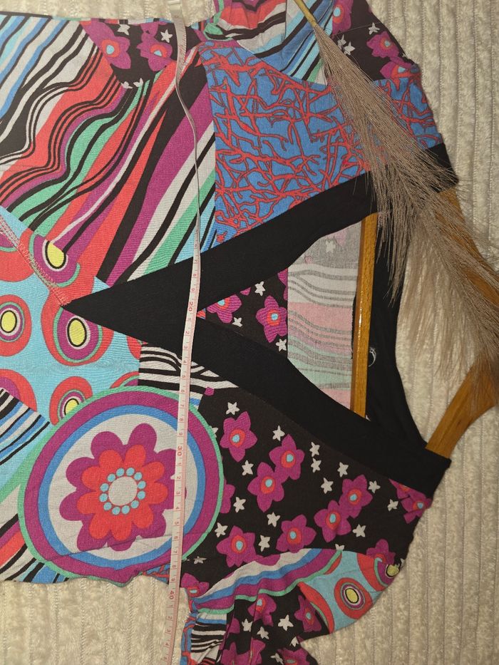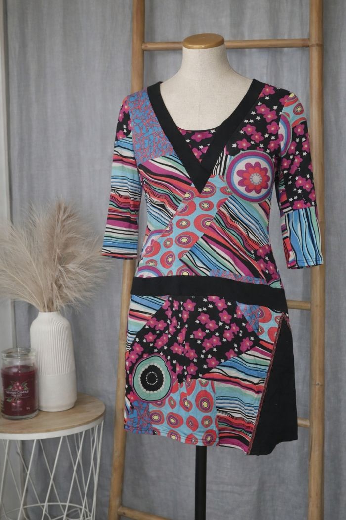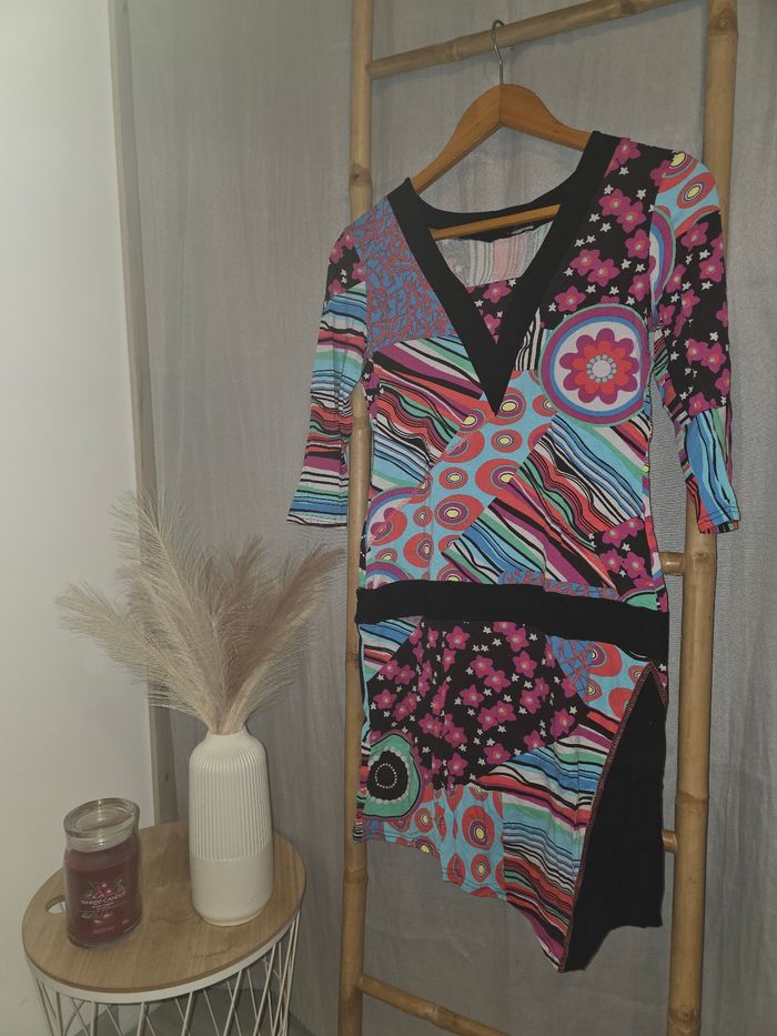 🌸 Robe femme colorée motifs graphiques 👗 Robe courte 🎨 Motifs multicolores (fleurs & graphiques) ✨ Encolure cache-cœur avec bandes noires contrastantes 👚 Manches 3/4 👌 Coupe ajustée et féminine 📏 Taille : 40 📌 État : très bon état ✨ Robe originale et confortable, parfaite pour le quotidien ou une occasion 🛍️ Regarde mon dressing pour réduire les frais 😊