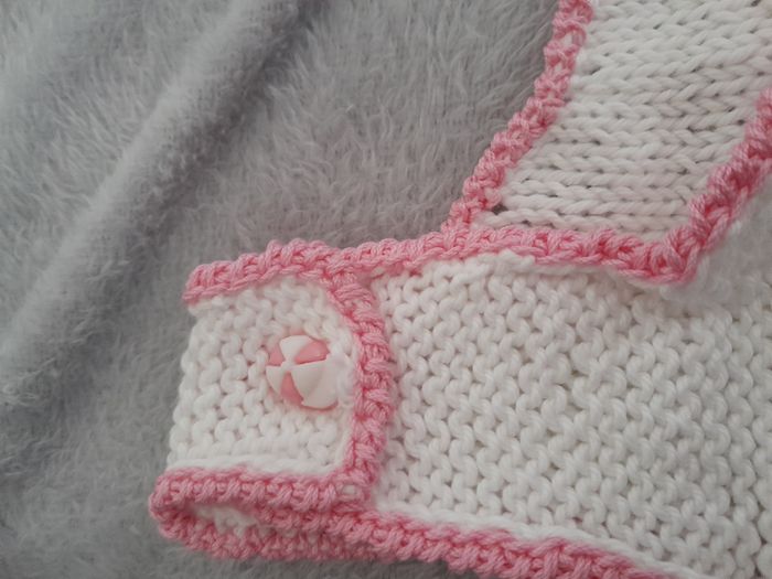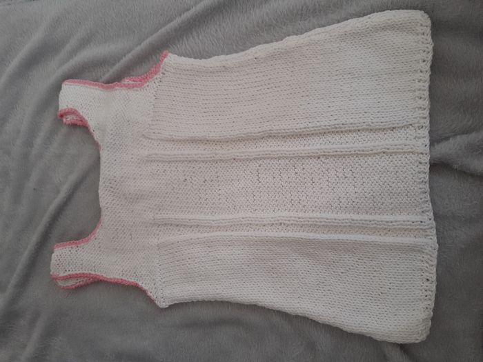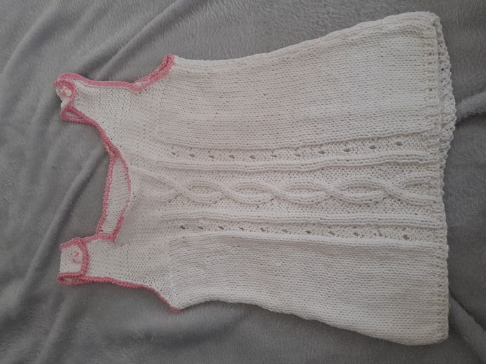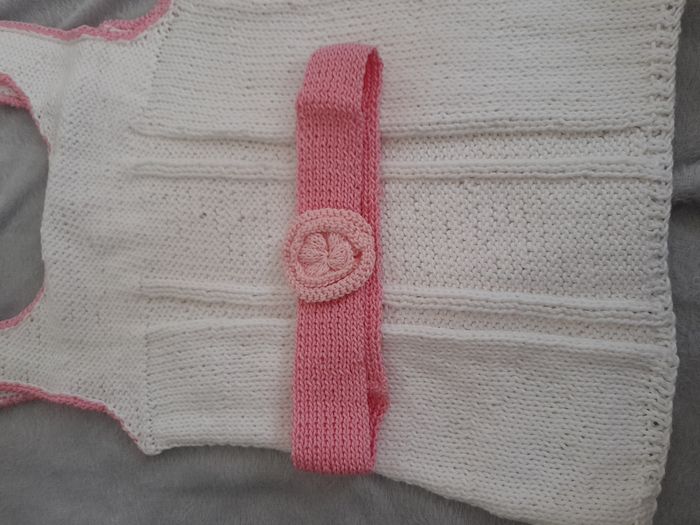 Robe + bandeau, attache bouton sur épaule, pour l'âge se référer au mesure Longueur : 43cm pour la robe, 19cm pour le bandeau Matière : 100 % Coton Marque : Fait main au tricot