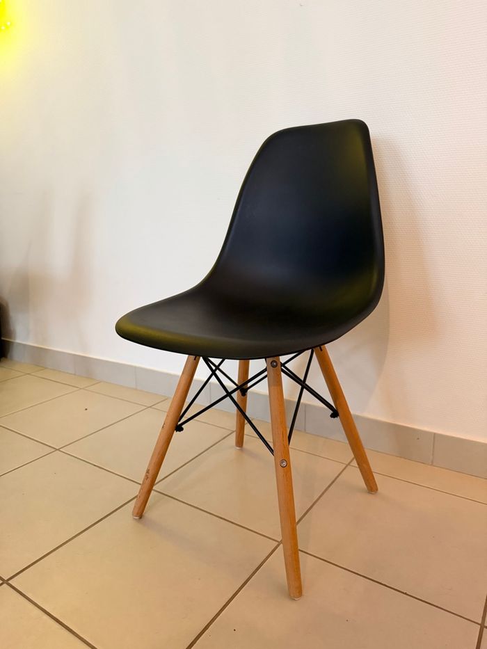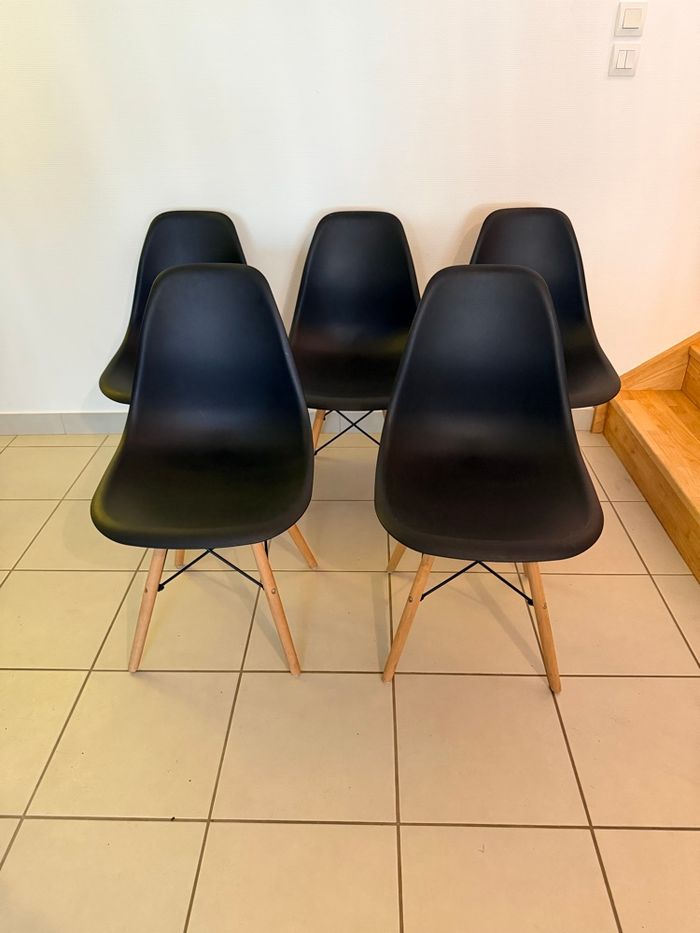 Je vends un lot de 5 chaises style scandinave, assise noire avec pieds en bois. Design moderne et épuré, elles s’intègrent facilement dans une salle à manger, une cuisine ou un bureau. ✔ Bon état ✔ Stables et confortables ✔ Vendues en lot uniquement Prix : 40€ (à compléter) À venir chercher sur place.