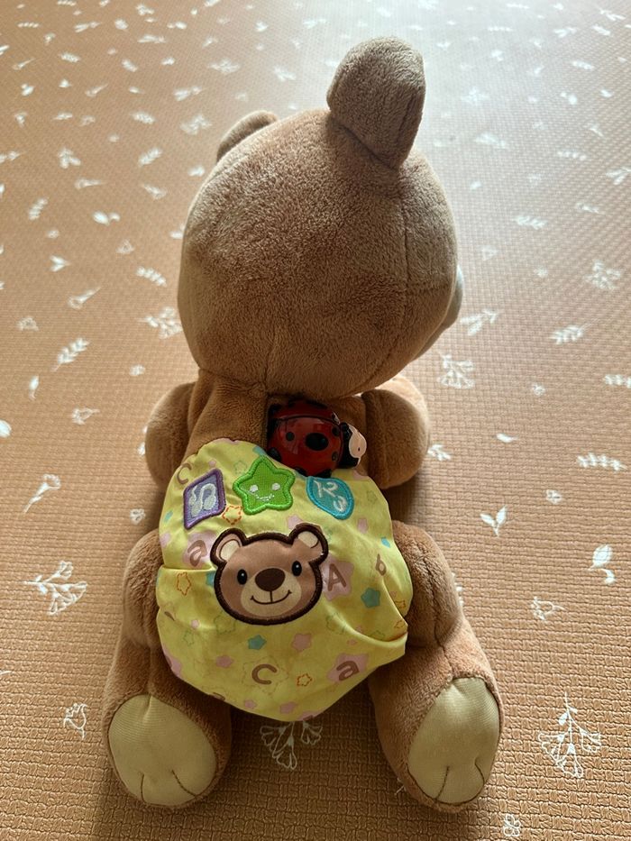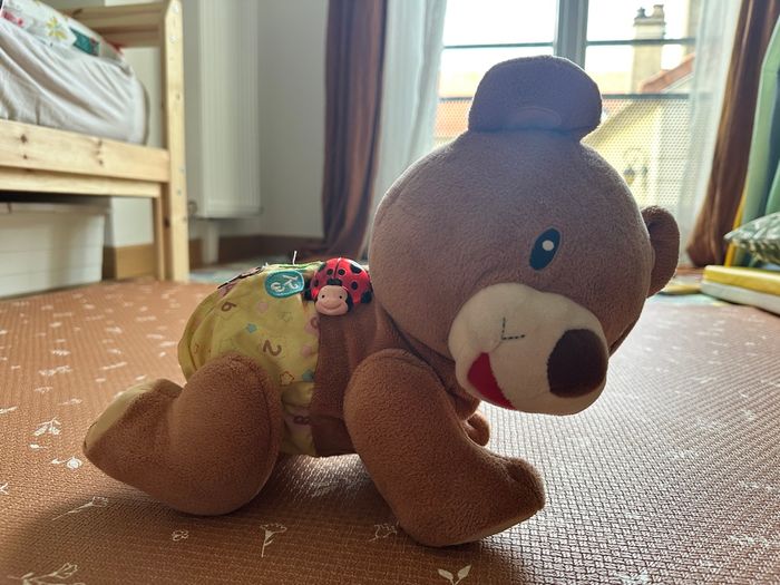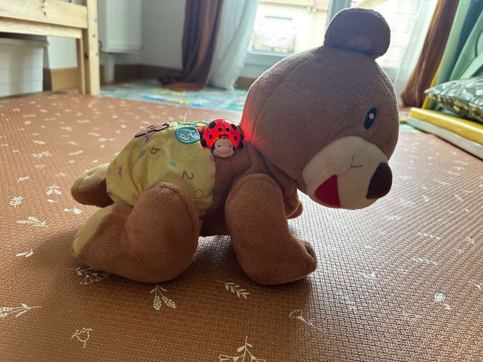 Vends cette peluche interactive Ourson 1,2,3 suis moi de la marque Vtech en excellent état. - Type de produit : Jouet d'éveil - Âge recommandé : De 0 à 3 ans - Fonctionnalités : Sonore, Interactif L’ourson avance tout seul et encourage bébé à se déplacer avec lui. Découverte des formes, des couleurs et des chiffres et le tout en musique. Envoi possible mais sans pile
