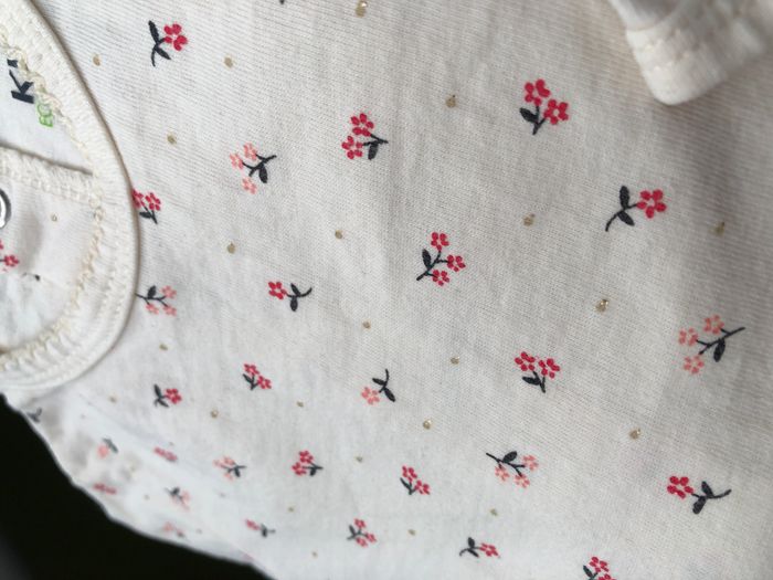 Pyjama une pièce, grenouillère, dors bien Kiabi, Taille 3 mois, Mi-saison, été. En coton crème, motifs petites fleurs roses et points beiges (certains avec une paillette dorée). Ouverture par pressions à l’arrière. En très bon état, sans trou ni tache. 🌸 Vous aimez cet article ? N’oubliez pas de visiter le reste de mon dressing en filtrant les tailles.