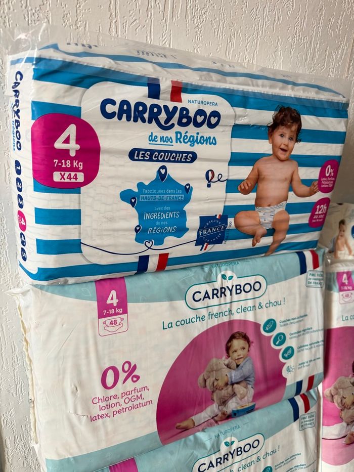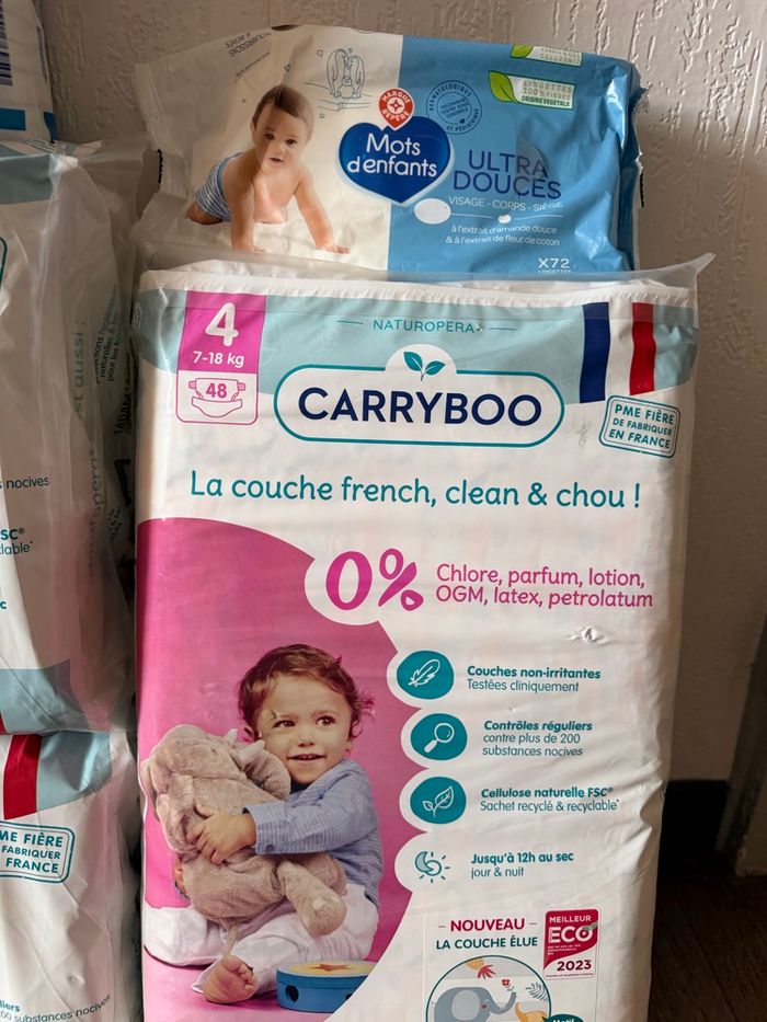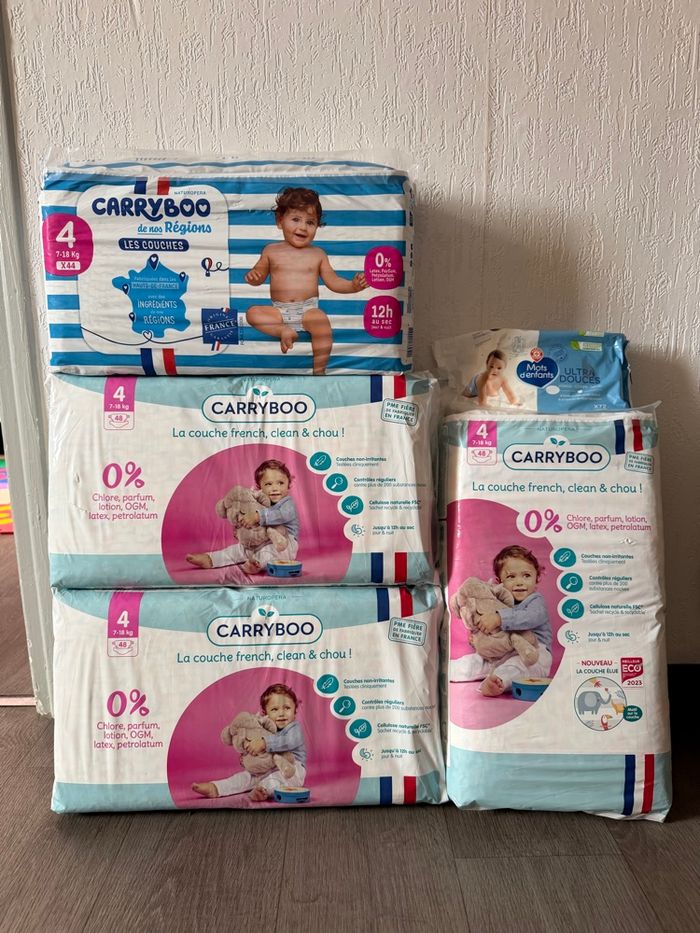 4 paquets Carryboo taille 4 (7-18kg) + Lingettes Mots d’enfants ultra douces