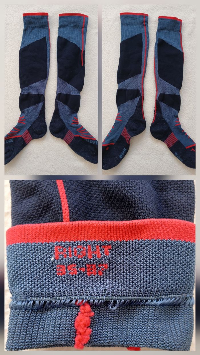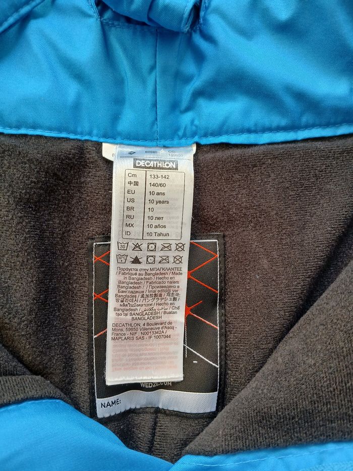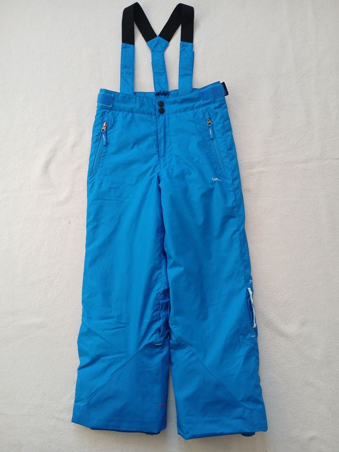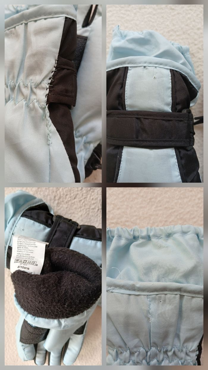 *Salopette de ski taille 10 ans. Marque wedze Extérieur impeccable, doublures bas de jambes abîmée (cf photos). Avec poches, réglable à la taille par des scratchs, système de serrage au jambe, bretelles amovibles. Le bas du pantalon n'est pas frotté. *paire de gants en taille 8/10 ans. Bon état général, intérieur doublé. Un gant a été recousu sur un côté. Quelques petites usures (cf photos) *paire de chaussettes de ski taille 35/37. Très bon état. Marque wedze.