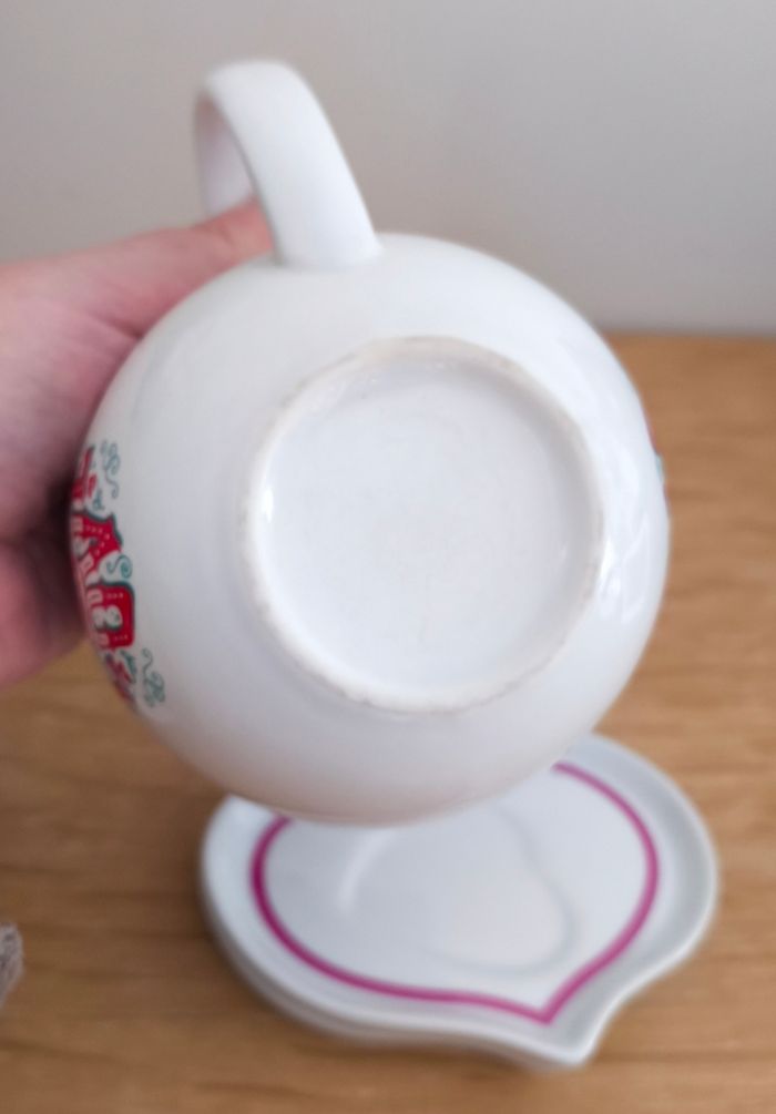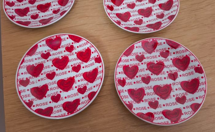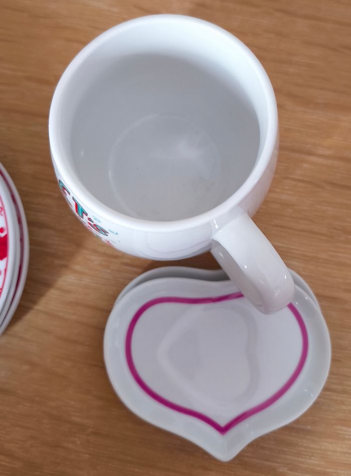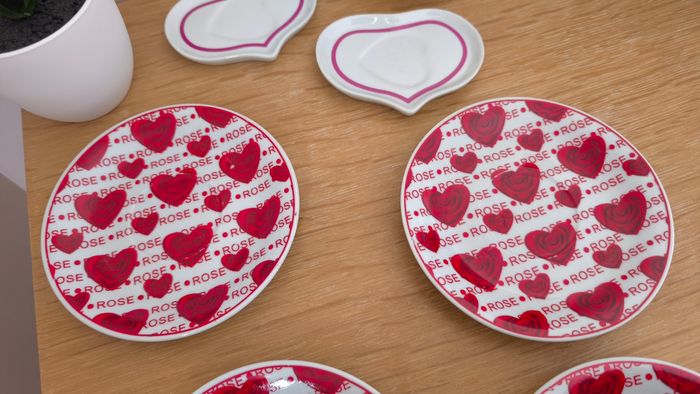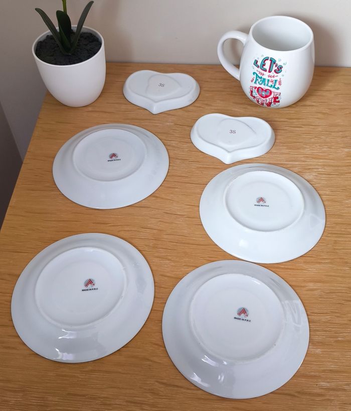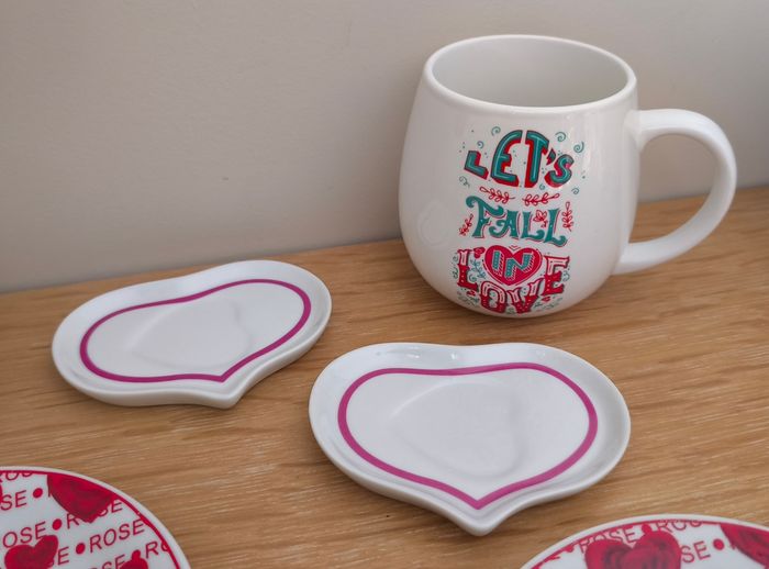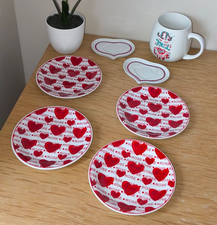 Lot spécial St Valentin - Grand mug (10,5 x 8,5 cm) - 2 sous-tasse ou repose sachet de thé en forme cœur (11,5 x 9 x 1 cm) - 4 petites assiettes à dessert (15 x 1,5 cm) ℹ️ Excellent état, le mug est neuf. Les assiettes à dessert ont quelques rayures sur les motifs mais ne gêne en rien #katO2600maison #grandmug #letsfallinlove #assietteadessert #soustasse #reposesachetthe #coeurs #rose #amour #stvalentin