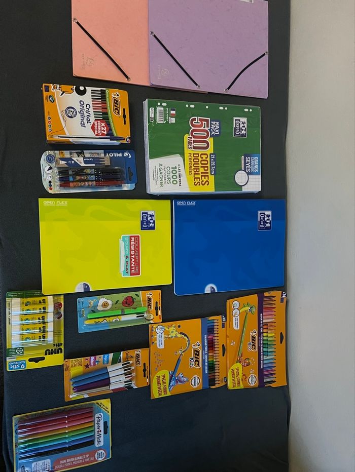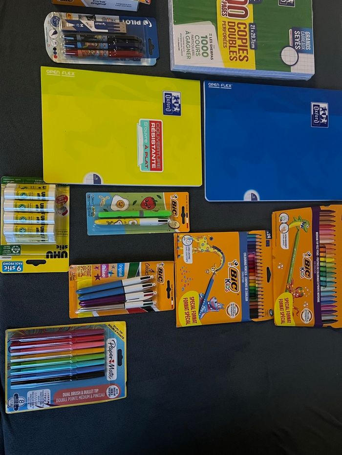 Neuf 2 chemises 1 paquet feuille double Oxford 1 cahier Oxford 24*32 1 cahier Oxford 21*29 1 paquet de feutre bic 1 paquet crayon de couleur bic 1 paquet 27 stylo bic 1 paquet frixion avec recharge 1 paquet de 8 stylos couleur paper mat 1 paquet de colle 9 bâtons Un paquet de 4 stylo 4 couleur bic Un stylo 4 couleur avec son marqueur Avec envoi rapide